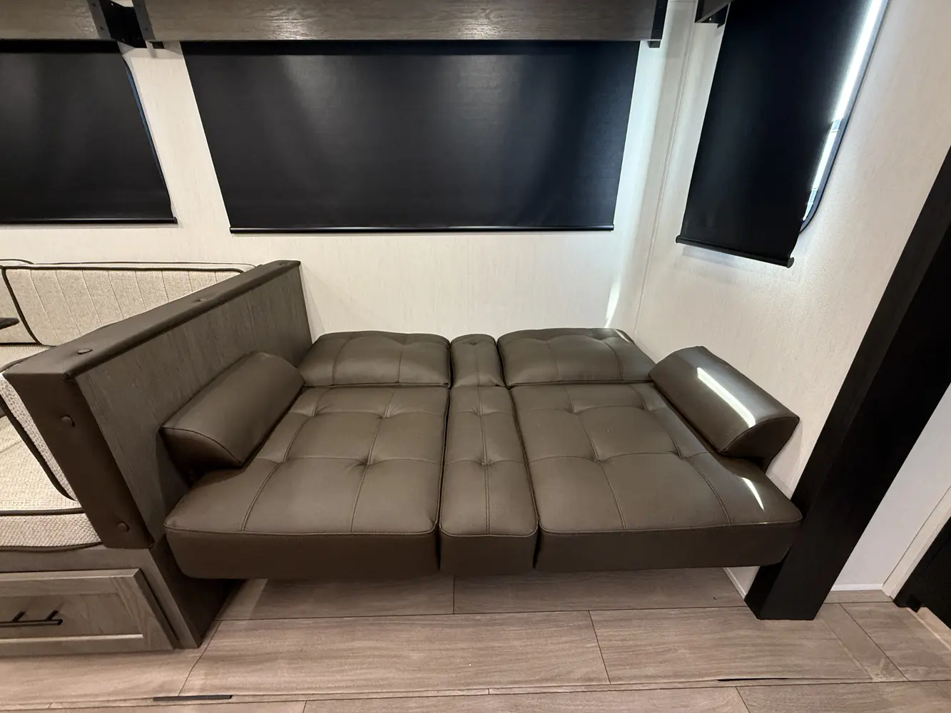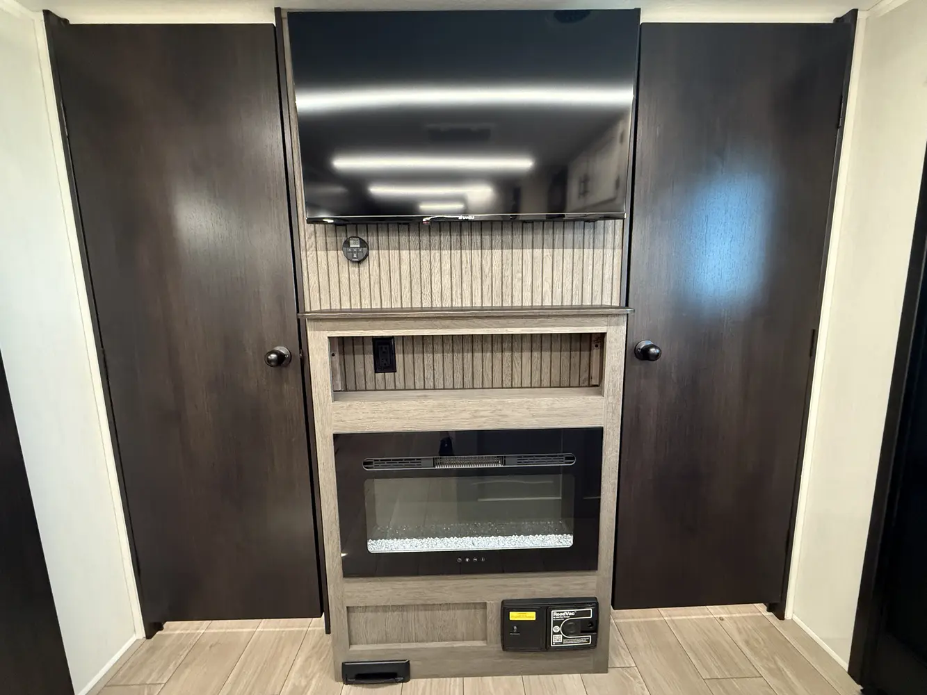 Available with either a bunk room or an extra bedroom with queen bed, the Alpha Wolf 280QBS by Forest River is a great option for families needing to maximize space in a form factor under 35 ft. A U-shaped dinette in the kitchen allows for plenty of seating and doubles as an extra bed when not in use. The living room features a cozy fireplace, TV hookups and a sofa also converts into extra sleeping. Relax up front with a queen size bed, laundry chute and plenty of wardrobe space.