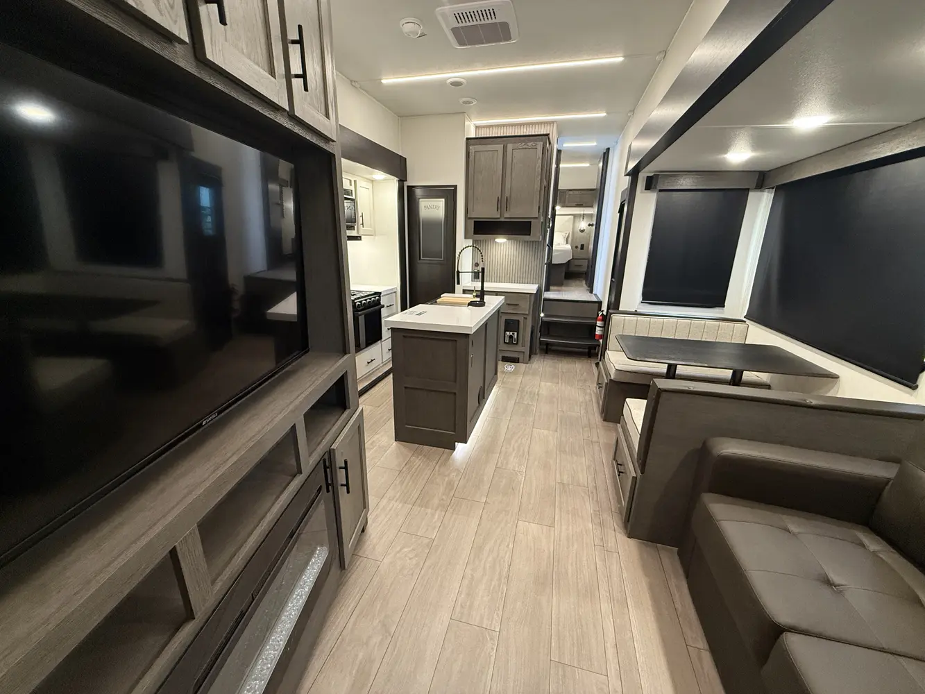The Arctic Wolf 331BH by Forest River offers a two-bedroom design in a relatively short 38 ft 3 in form factor. In the rear is a half bathroom, 54x74 bunk, built in wardrobe storage and a 60x80 loft bunk overhead. Chef's will appreciate the island kitchen that features a 12-volt refrigerator, microwave, oven, trash can drawer, breakfast hutch and dinette that converts into a bed. Up front is a queen bed, two wardrobes and a full bathroom.