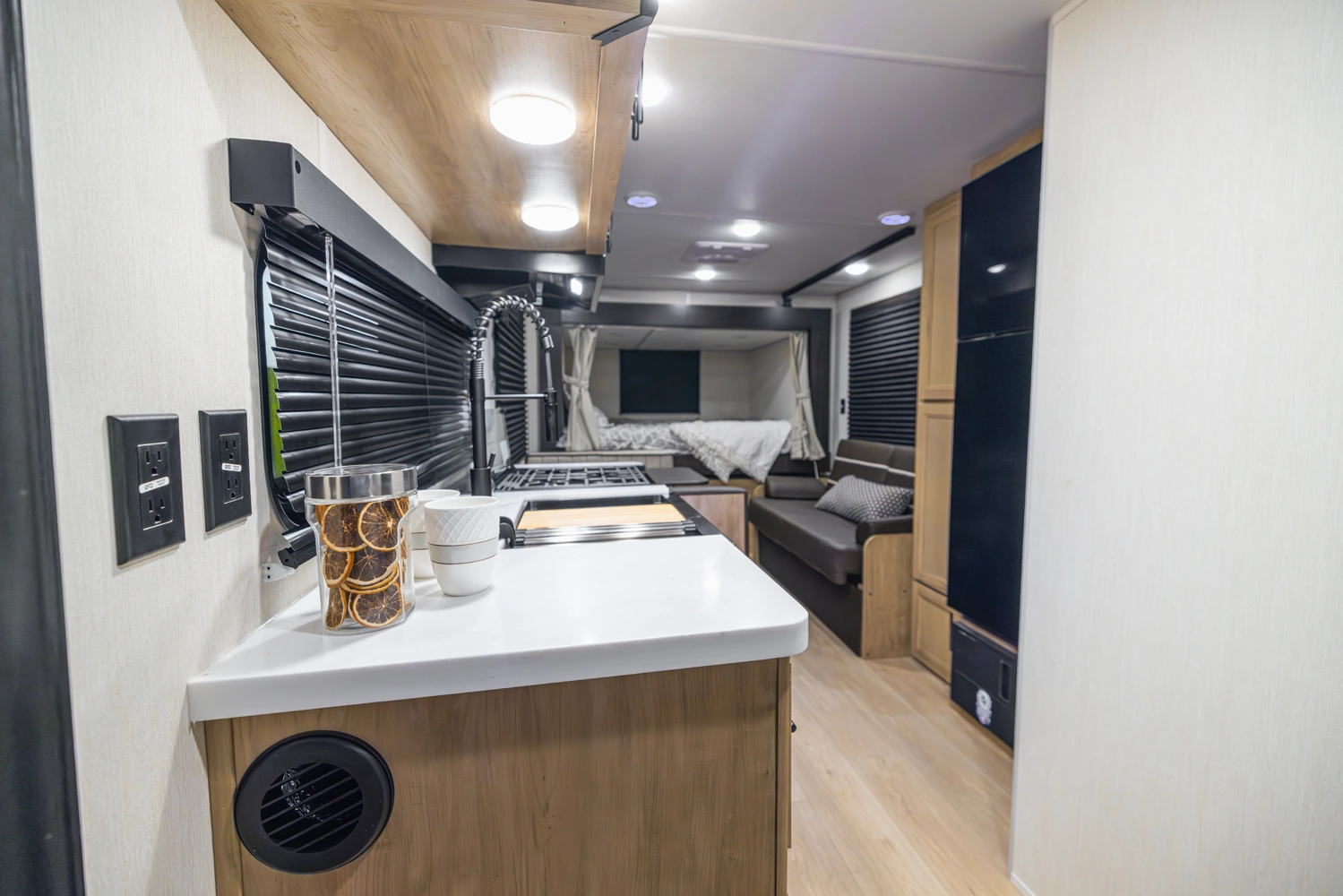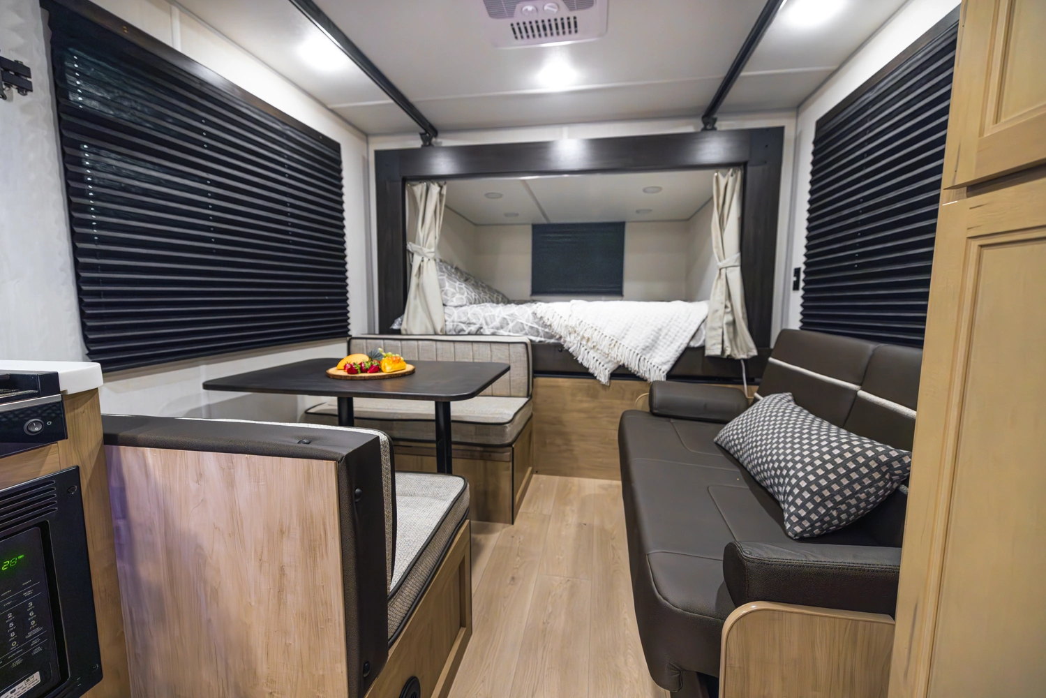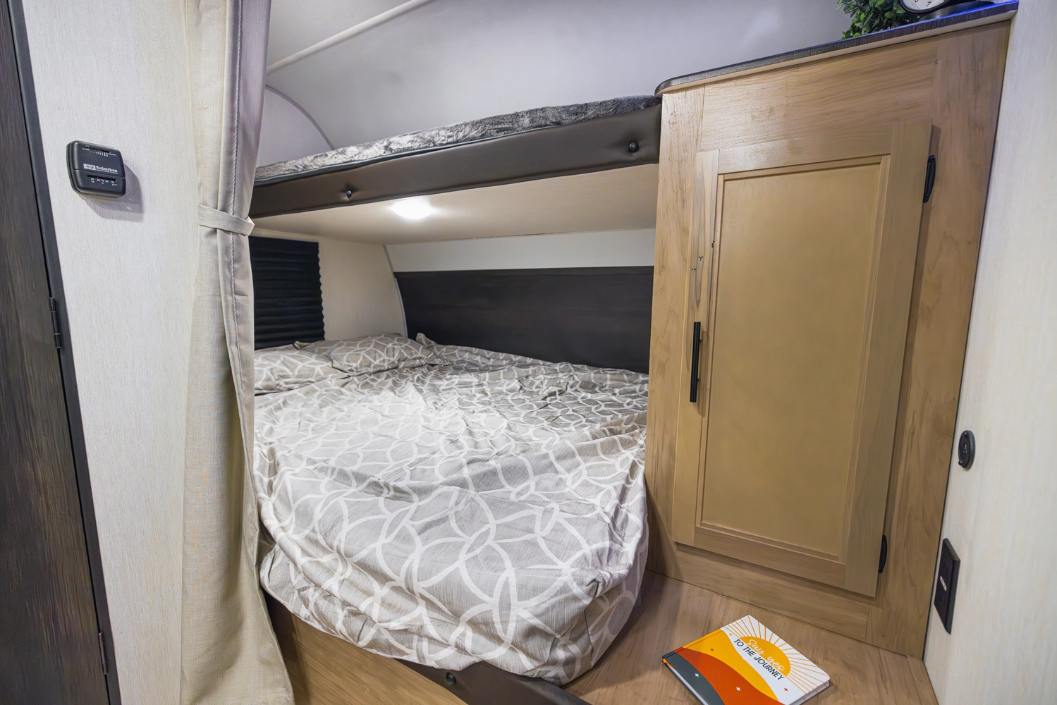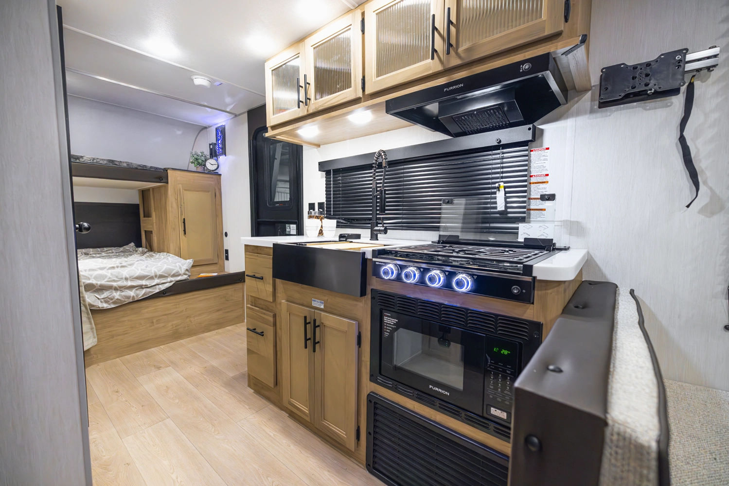 The 19SMBL has much to offer in a small package with sleeping for up to eight! The 19SMBL features two queen beds including a bunk above the front bed. The rear queen bed slide provides sleeping space without adding tow length. The modern chef’s kitchen offers the right combination of functionality and storage with a spacious pantry. The rear dinette, and sofa are great seating areas, and double for additional sleeping. The exterior entertainment area has everything you need to enjoy a nice day.