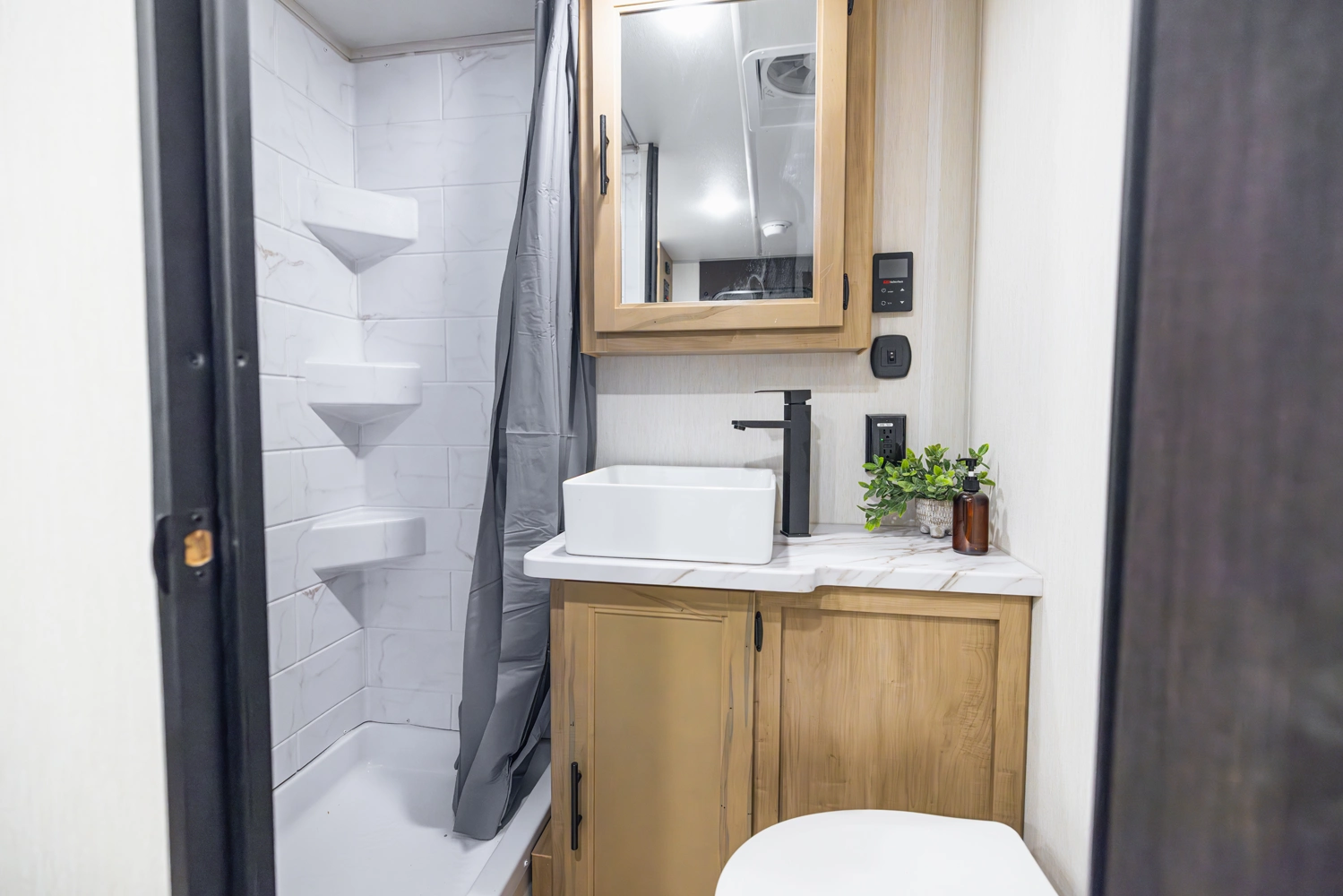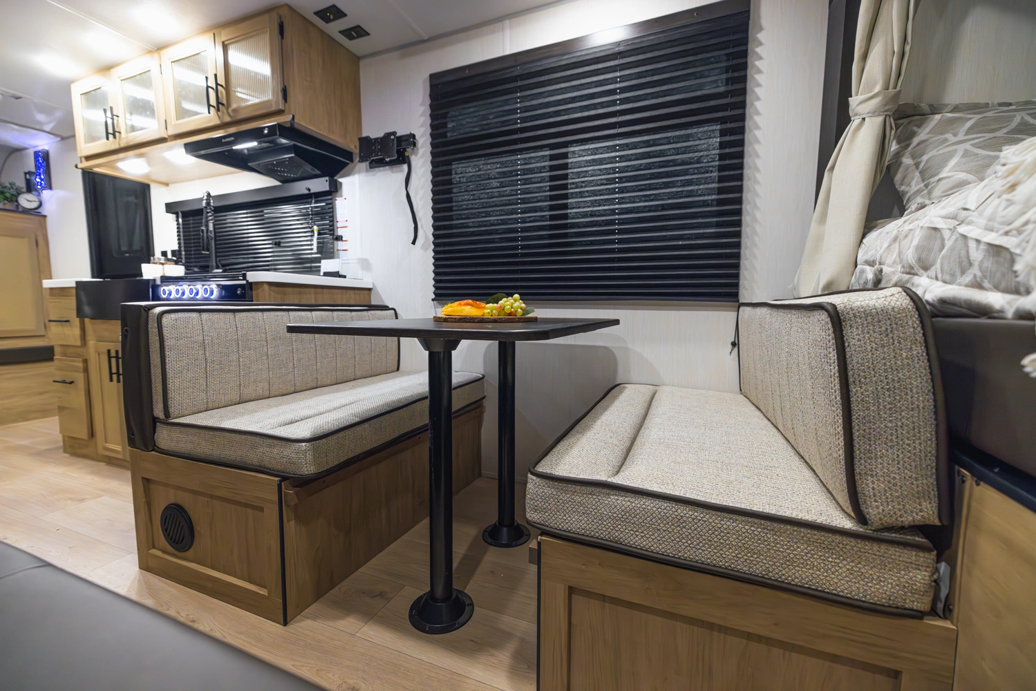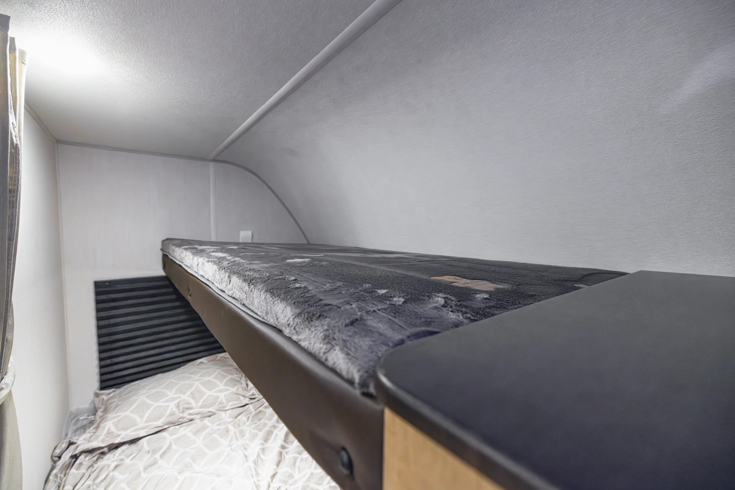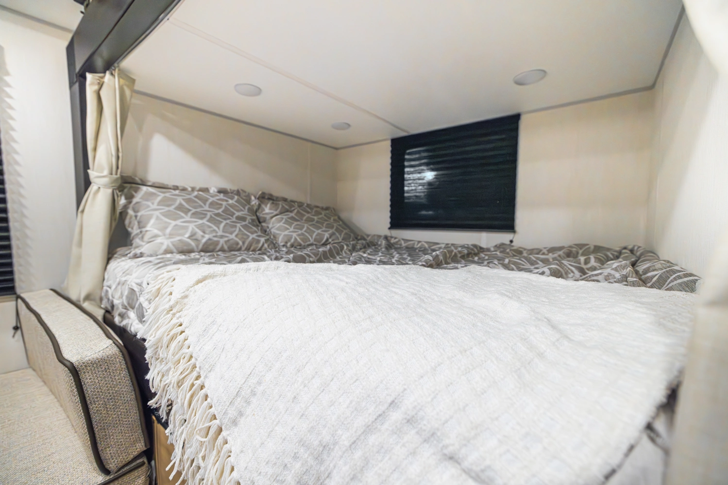 The 19SMBL has much to offer in a small package with sleeping for up to eight! The 19SMBL features two queen beds including a bunk above the front bed. The rear queen bed slide provides sleeping space without adding tow length. The modern chef’s kitchen offers the right combination of functionality and storage with a spacious pantry. The rear dinette, and sofa are great seating areas, and double for additional sleeping. The exterior entertainment area has everything you need to enjoy a nice day.