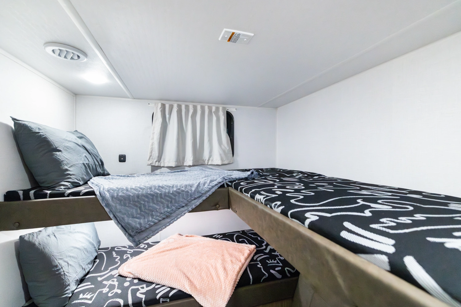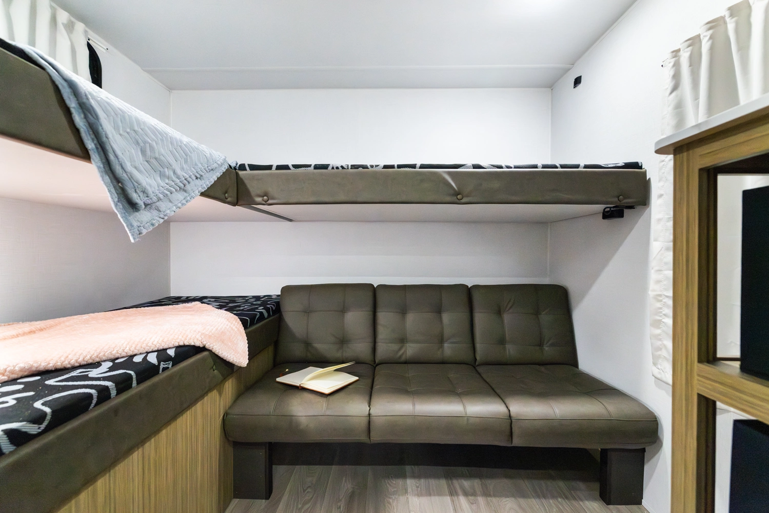 The 273QBXL is a versatile, lightweight bunkhouse that weighs in at less than 6,000 lbs. This travel trailer is packed with features, including bunks, an outside kitchen, U-dinette, Versa-Lounge, and walk-in shower. The kitchen includes an oversized 11 CU. FT. refrigerator, stovetop, oven, and pantry.