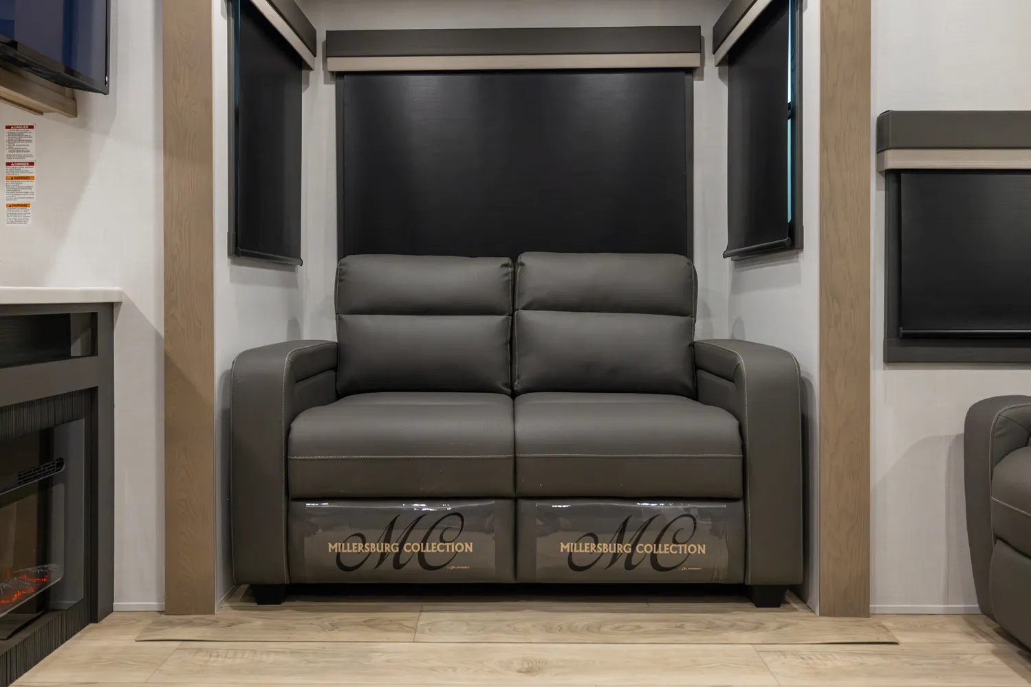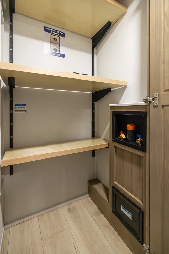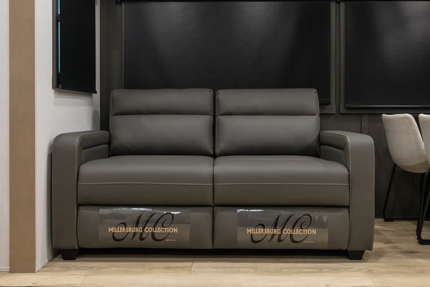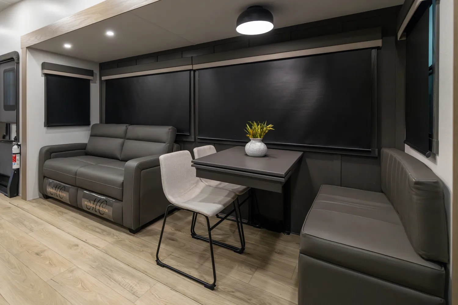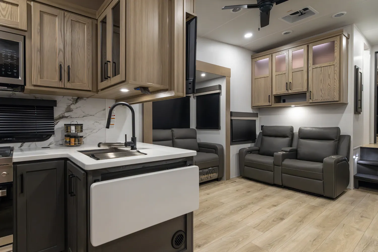 One of the best entertainment centers in the industry! This 371RK 5th wheel will entertain your family and friends for a night of relaxation after a long day of camping. It features a 68" Hide-a-Bed, a 60" Hide-a-Bed & 60" theater seating. Its front bedroom features a queen bed, (optional King) massive wardrobe storage & Washer/Dryer prep. The rear kitchen offers tons of counterspace paired with ample cabinet space, drawers, pantry storage & a trash can drawer.