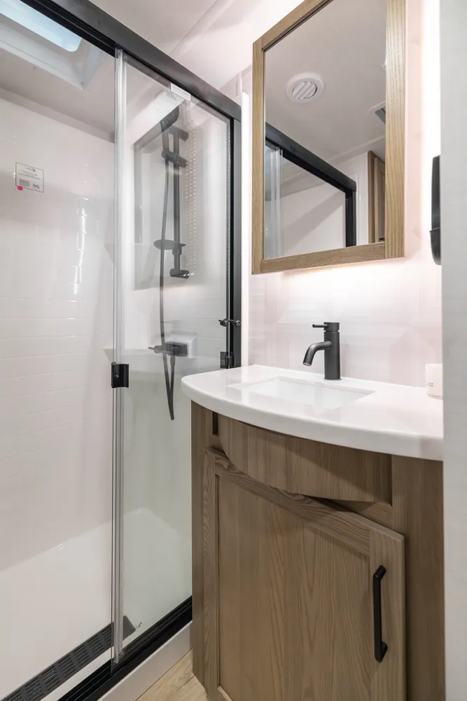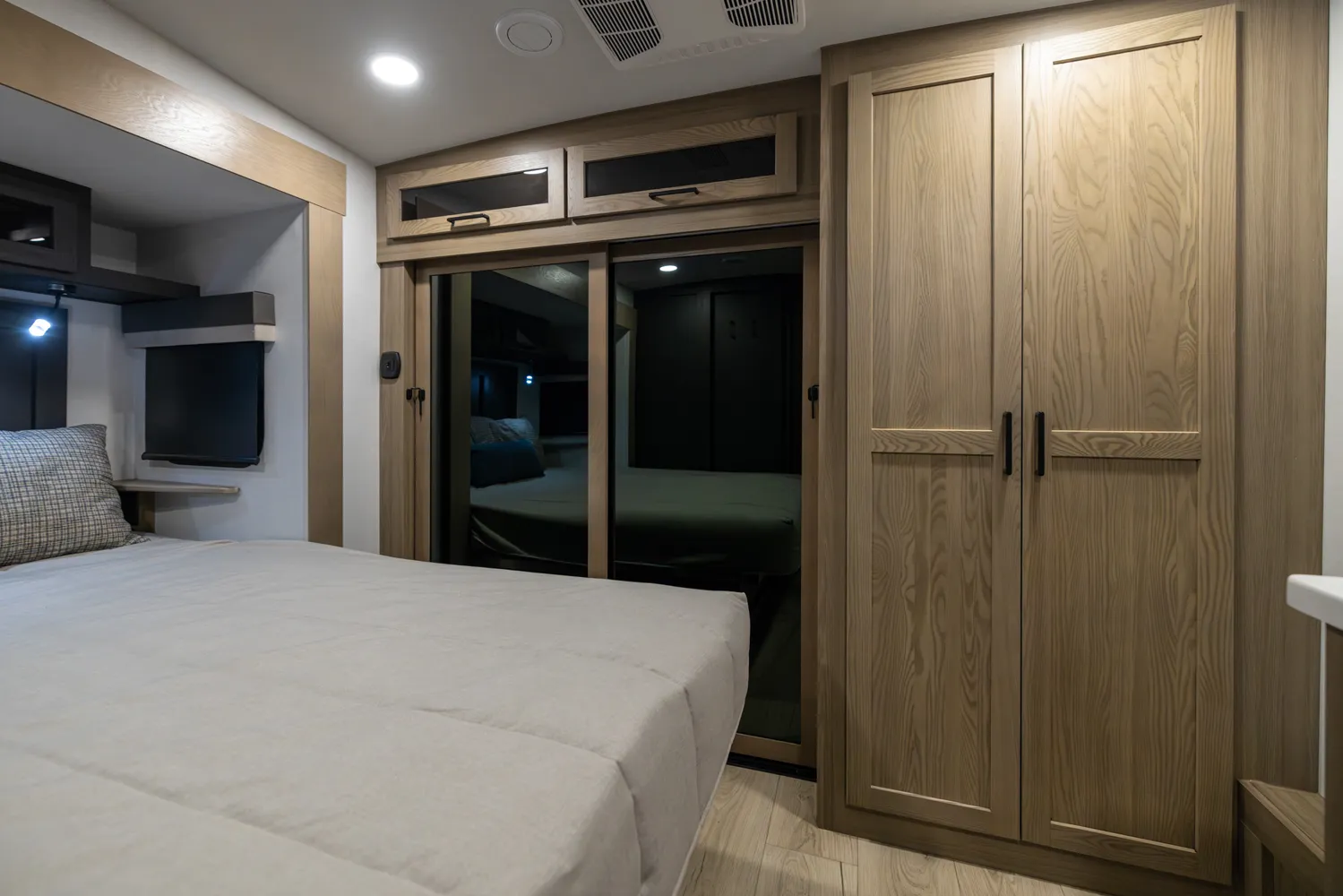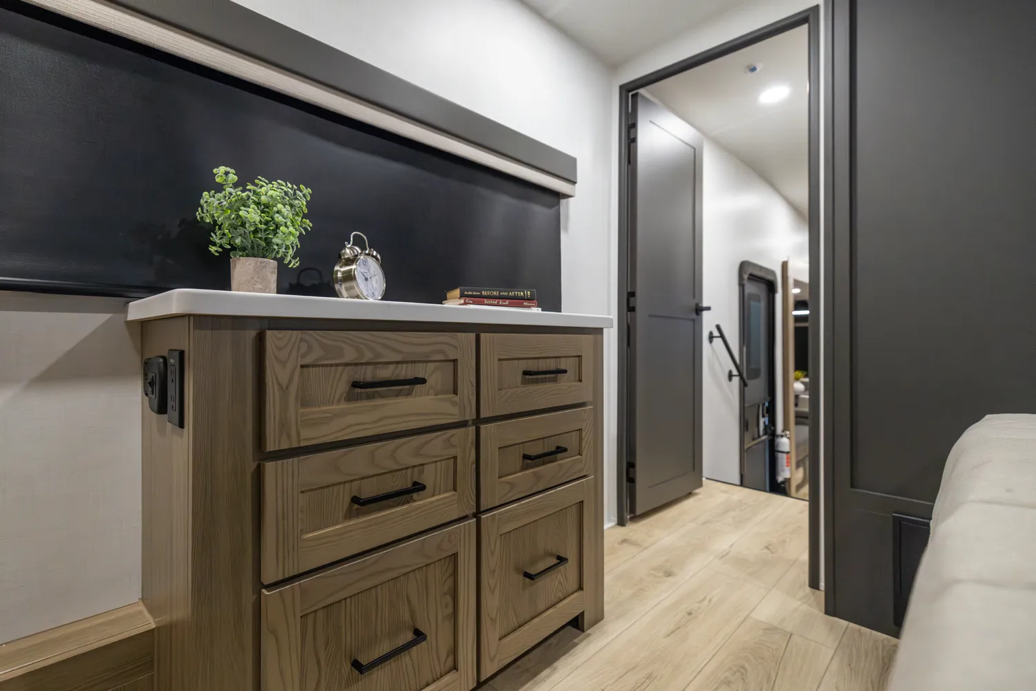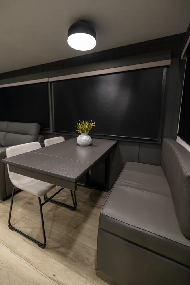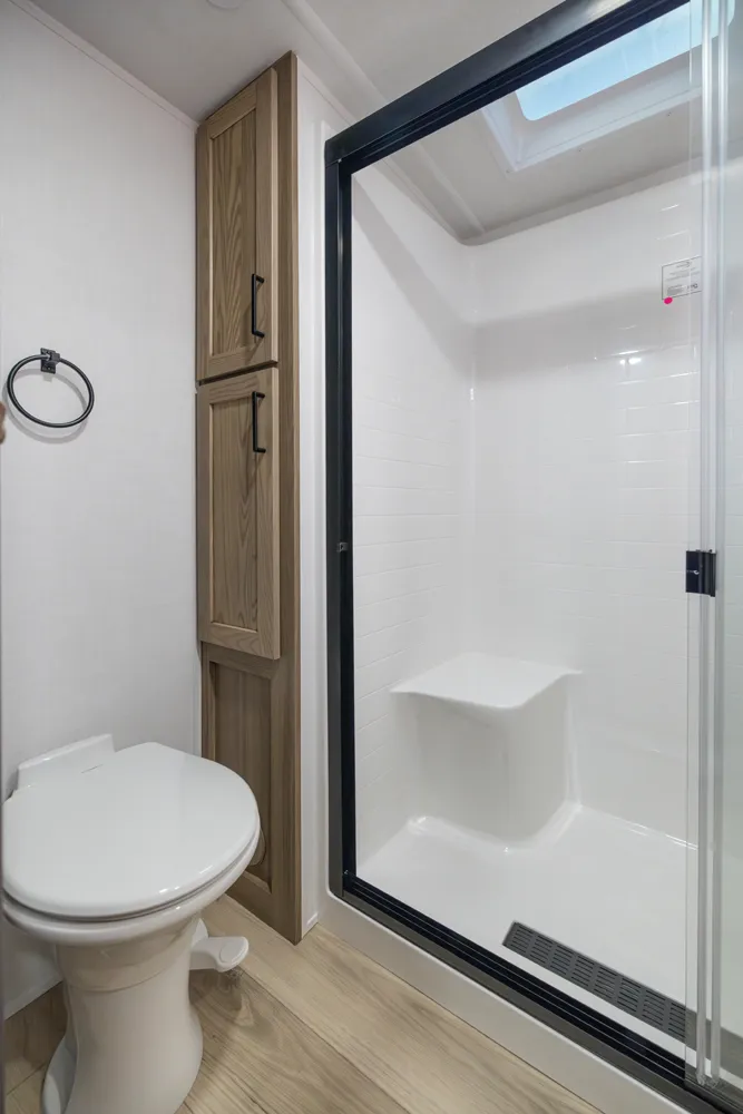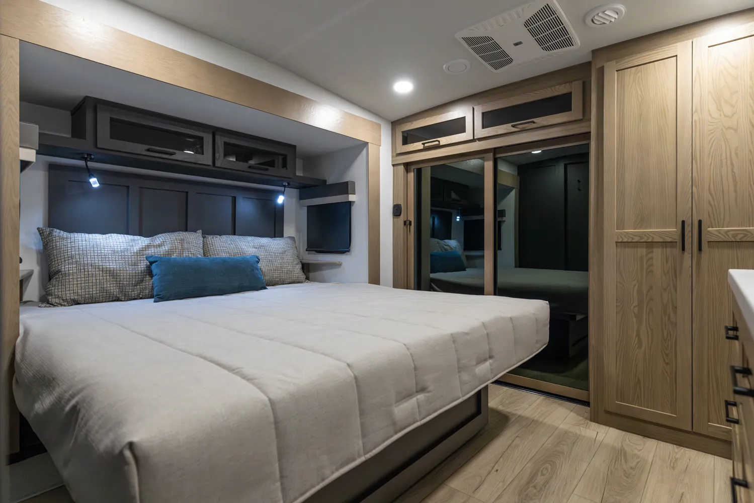 One of the best entertainment centers in the industry! This 371RK 5th wheel will entertain your family and friends for a night of relaxation after a long day of camping. It features a 68" Hide-a-Bed, a 60" Hide-a-Bed & 60" theater seating. Its front bedroom features a queen bed, (optional King) massive wardrobe storage & Washer/Dryer prep. The rear kitchen offers tons of counterspace paired with ample cabinet space, drawers, pantry storage & a trash can drawer.
