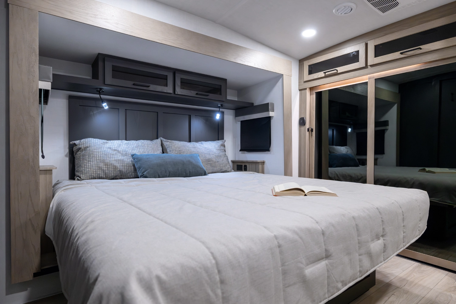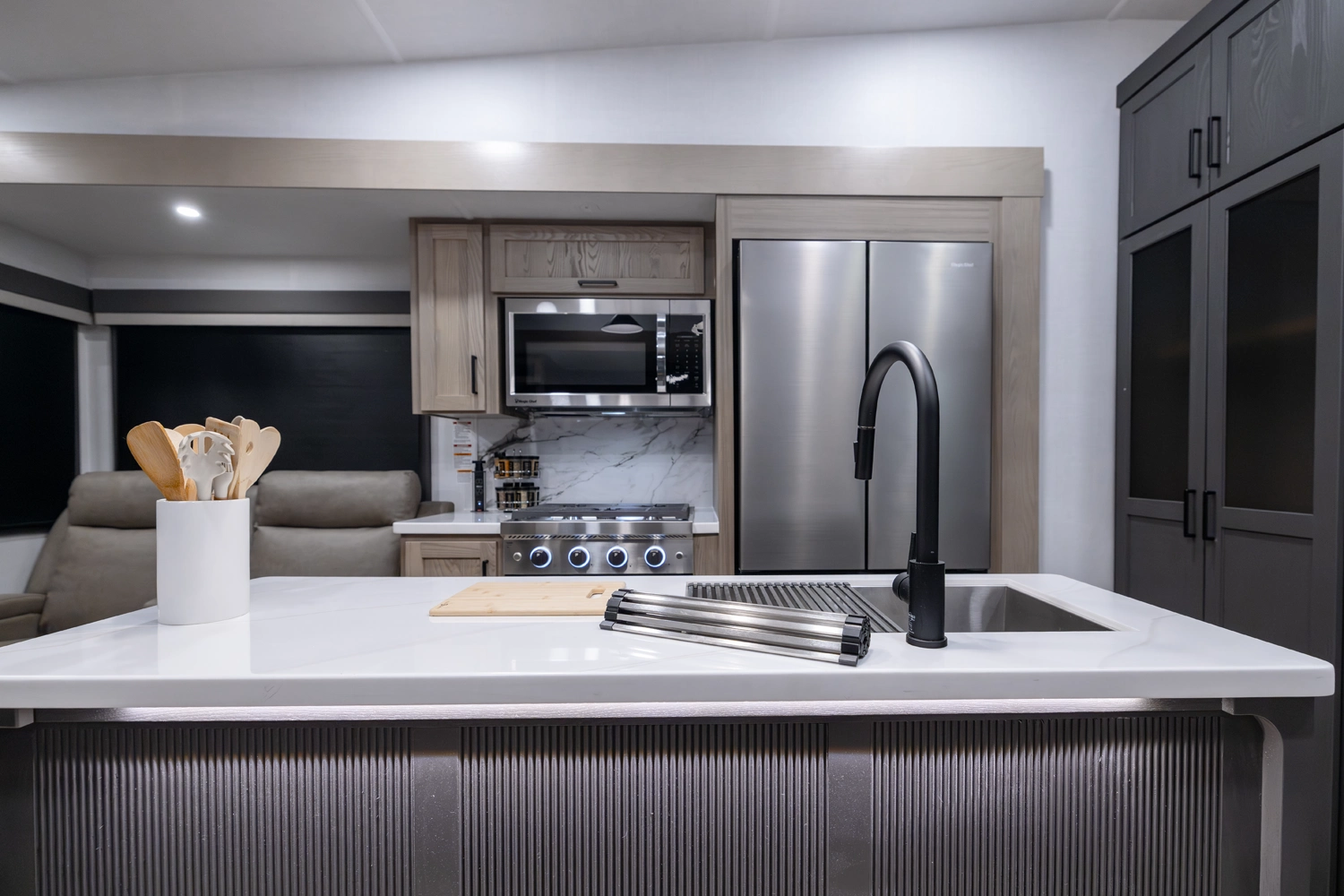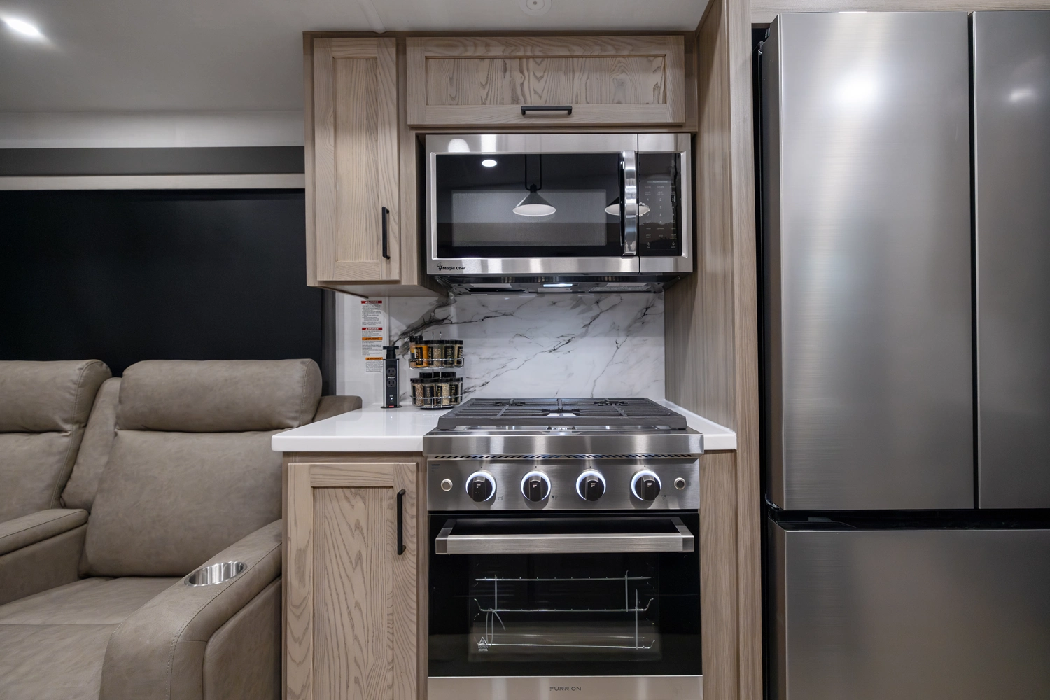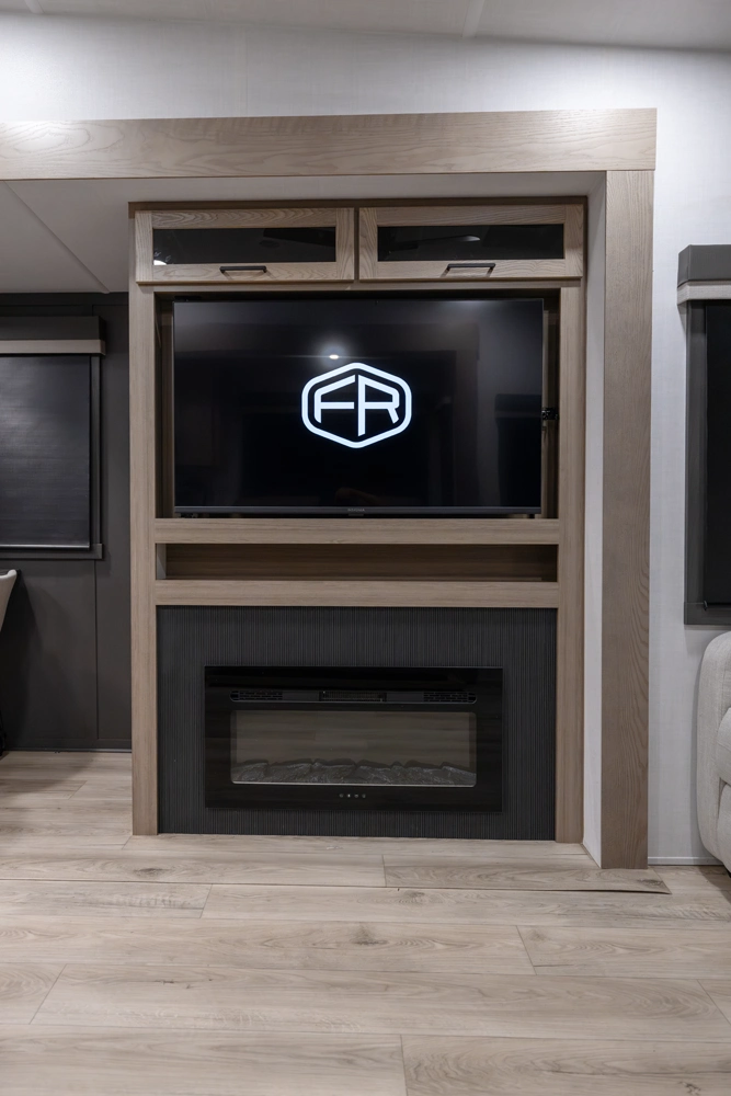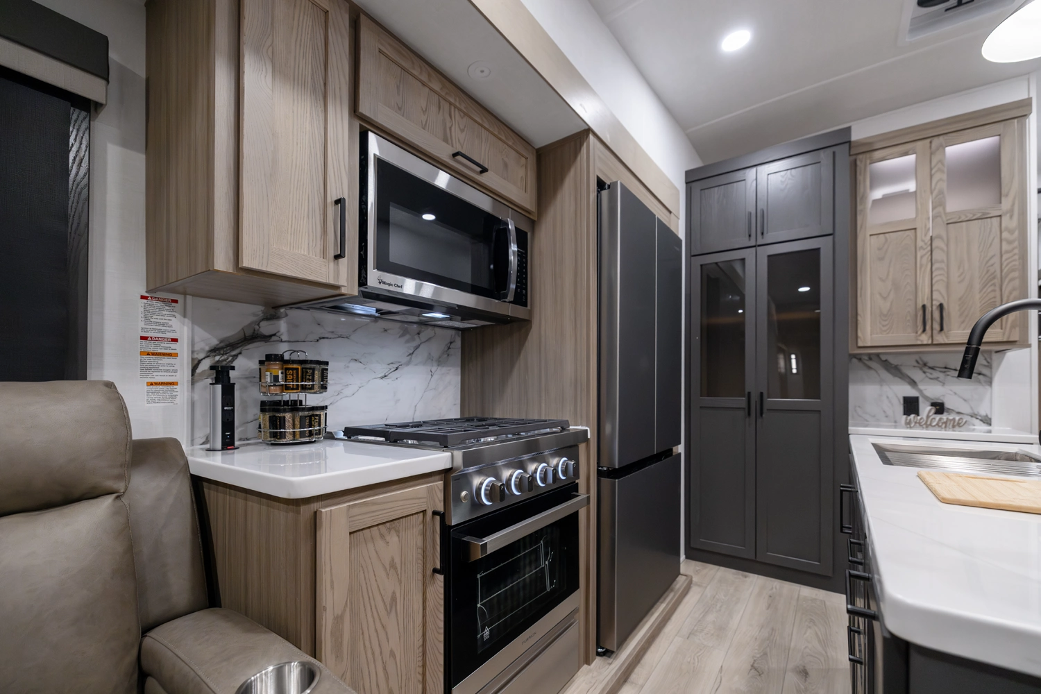 This luxurious rear living floorplan features a 78" hide-a-bed sofa, 60" theater seating, and a fireplace with TV for cozy relaxation. The spacious kitchen offers an island, pantry, and outside kitchen with griddle. The private front bedroom includes a king bed, dresser, washer/dryer prep, and wardrobes. With dual awnings, pass-thru storage, and premium finishes throughout, it’s perfect for extended stays or weekend adventures.