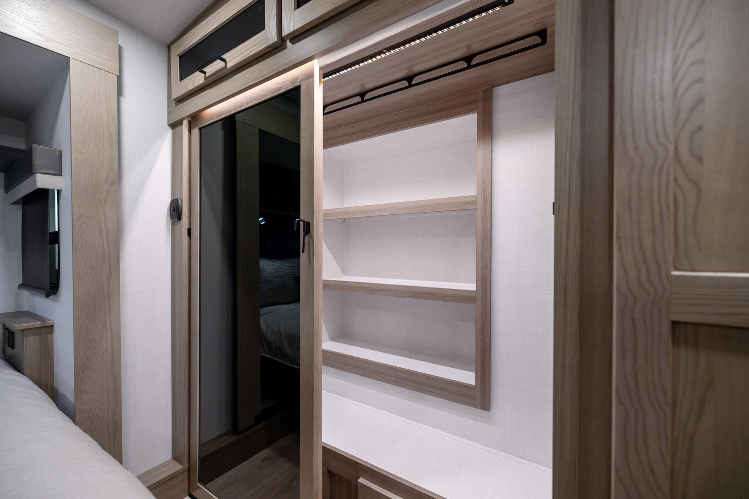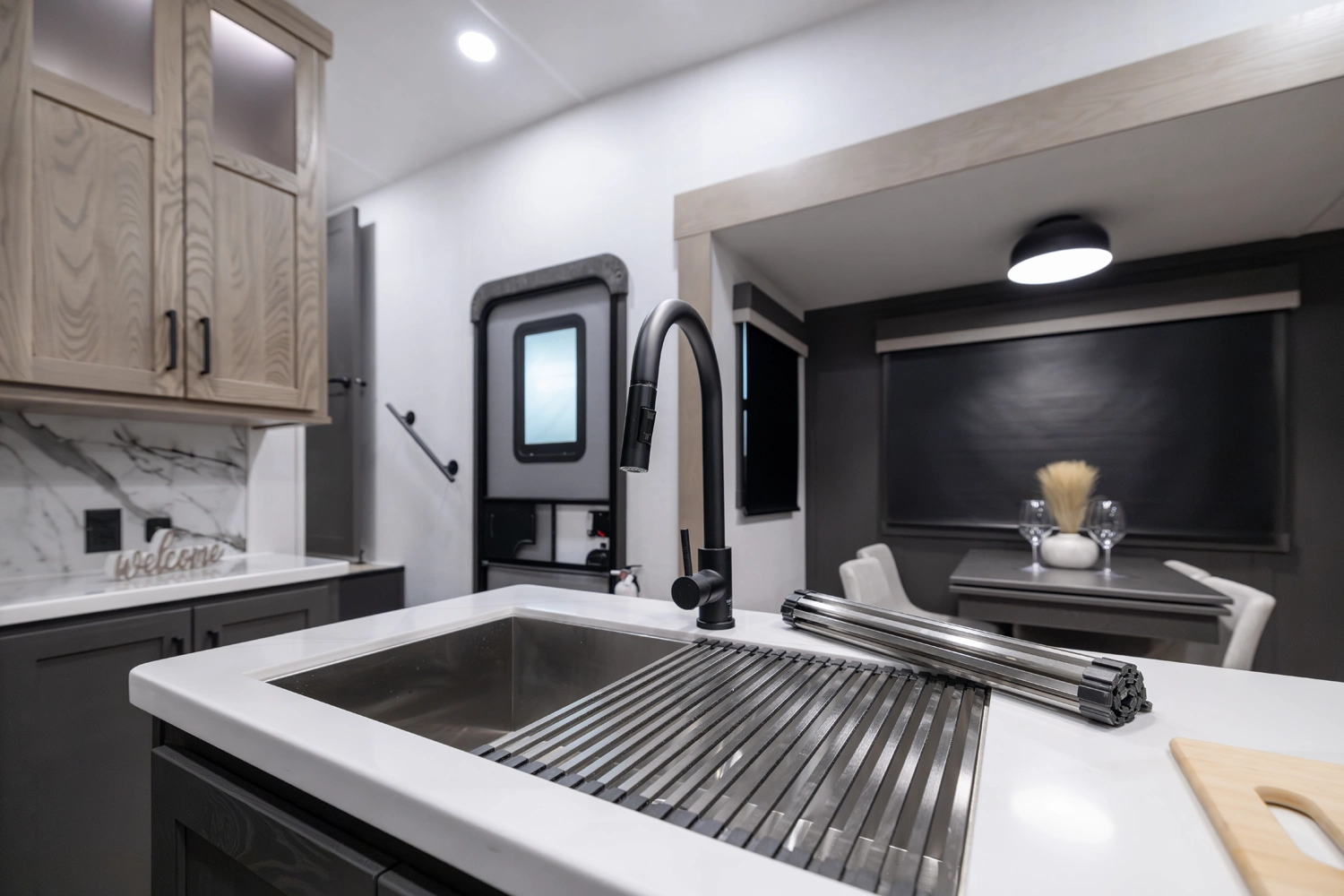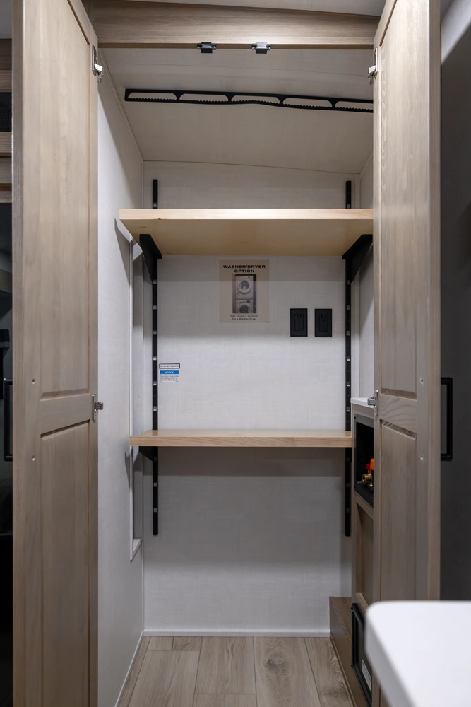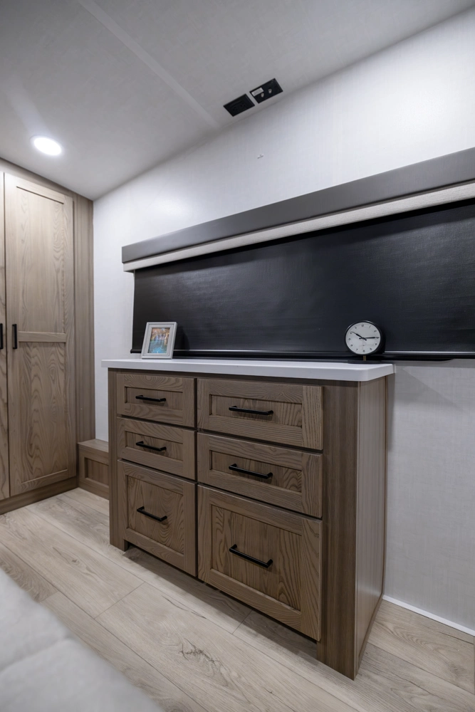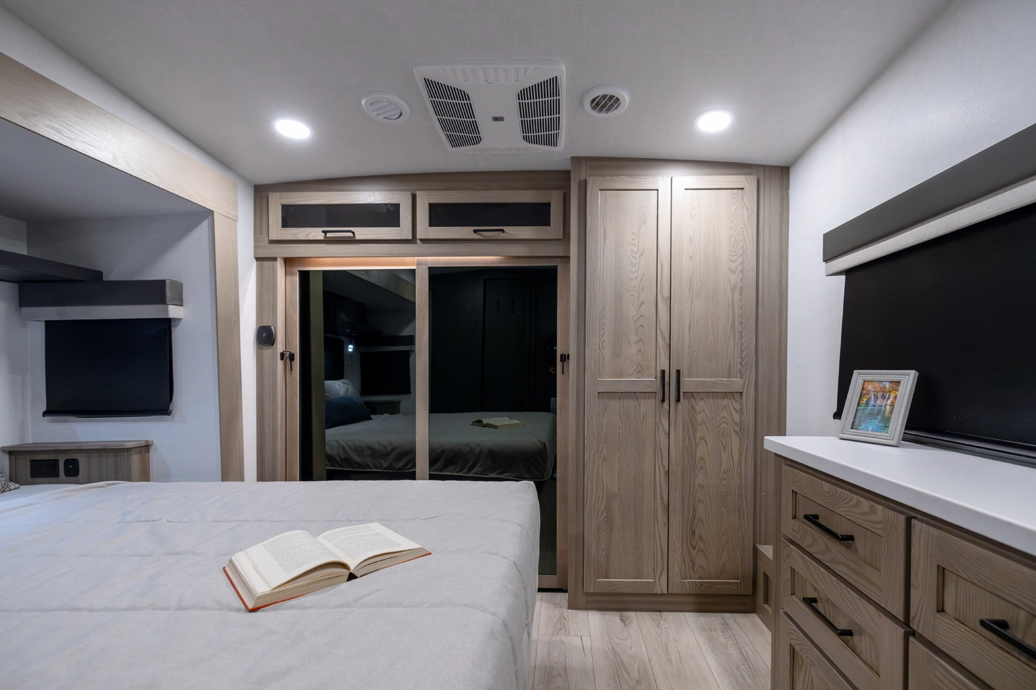 This luxurious rear living floorplan features a 78" hide-a-bed sofa, 60" theater seating, and a fireplace with TV for cozy relaxation. The spacious kitchen offers an island, pantry, and outside kitchen with griddle. The private front bedroom includes a king bed, dresser, washer/dryer prep, and wardrobes. With dual awnings, pass-thru storage, and premium finishes throughout, it’s perfect for extended stays or weekend adventures.