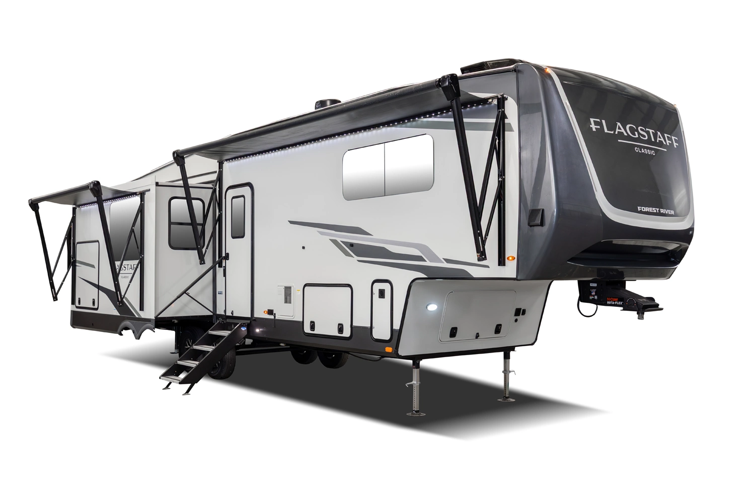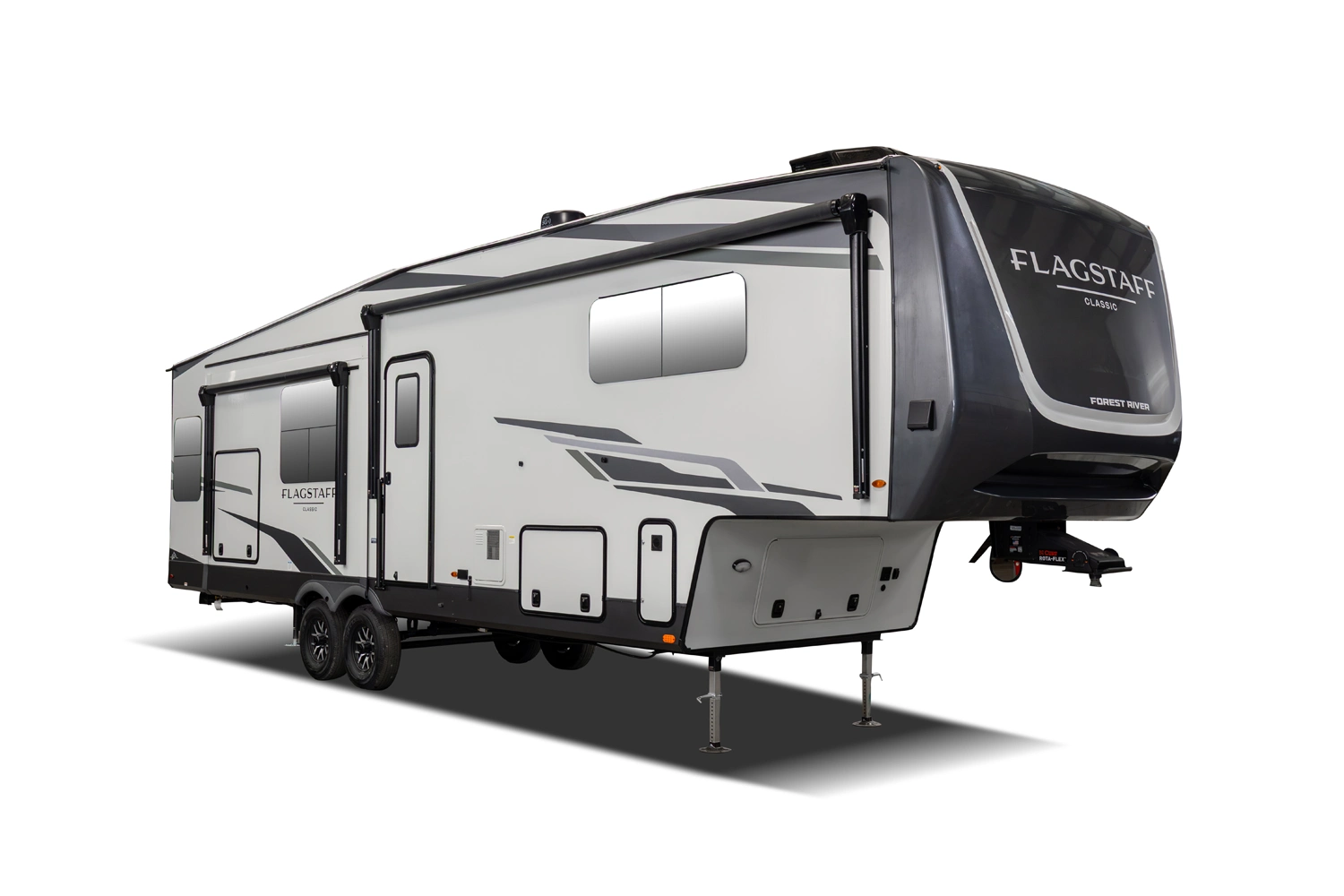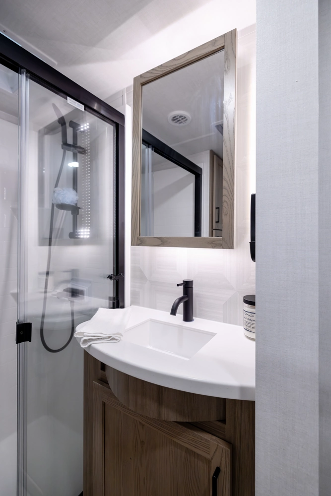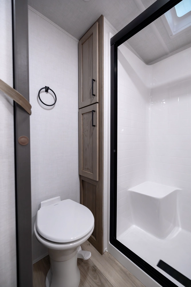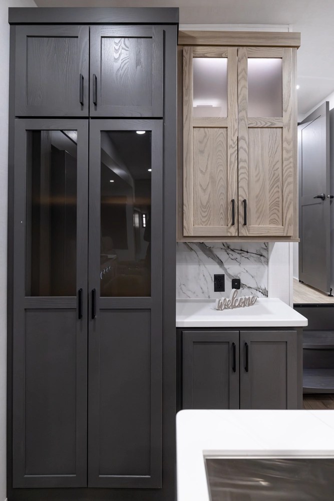 This luxurious rear living floorplan features a 78" hide-a-bed sofa, 60" theater seating, and a fireplace with TV for cozy relaxation. The spacious kitchen offers an island, pantry, and outside kitchen with griddle. The private front bedroom includes a king bed, dresser, washer/dryer prep, and wardrobes. With dual awnings, pass-thru storage, and premium finishes throughout, it’s perfect for extended stays or weekend adventures.