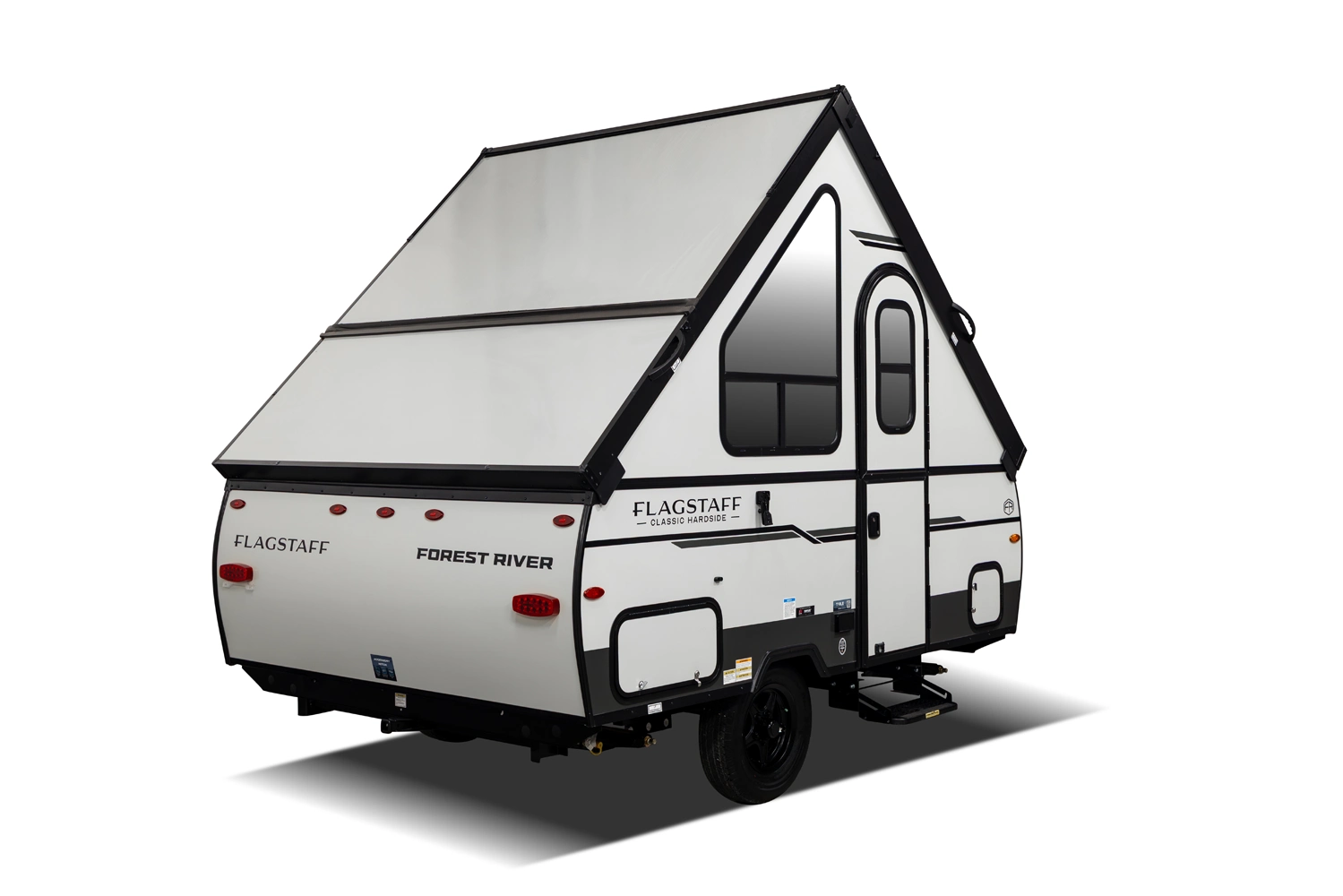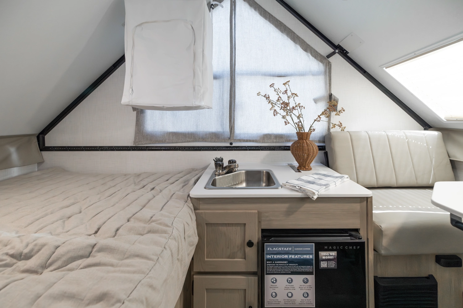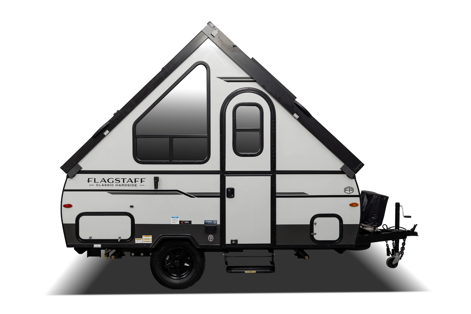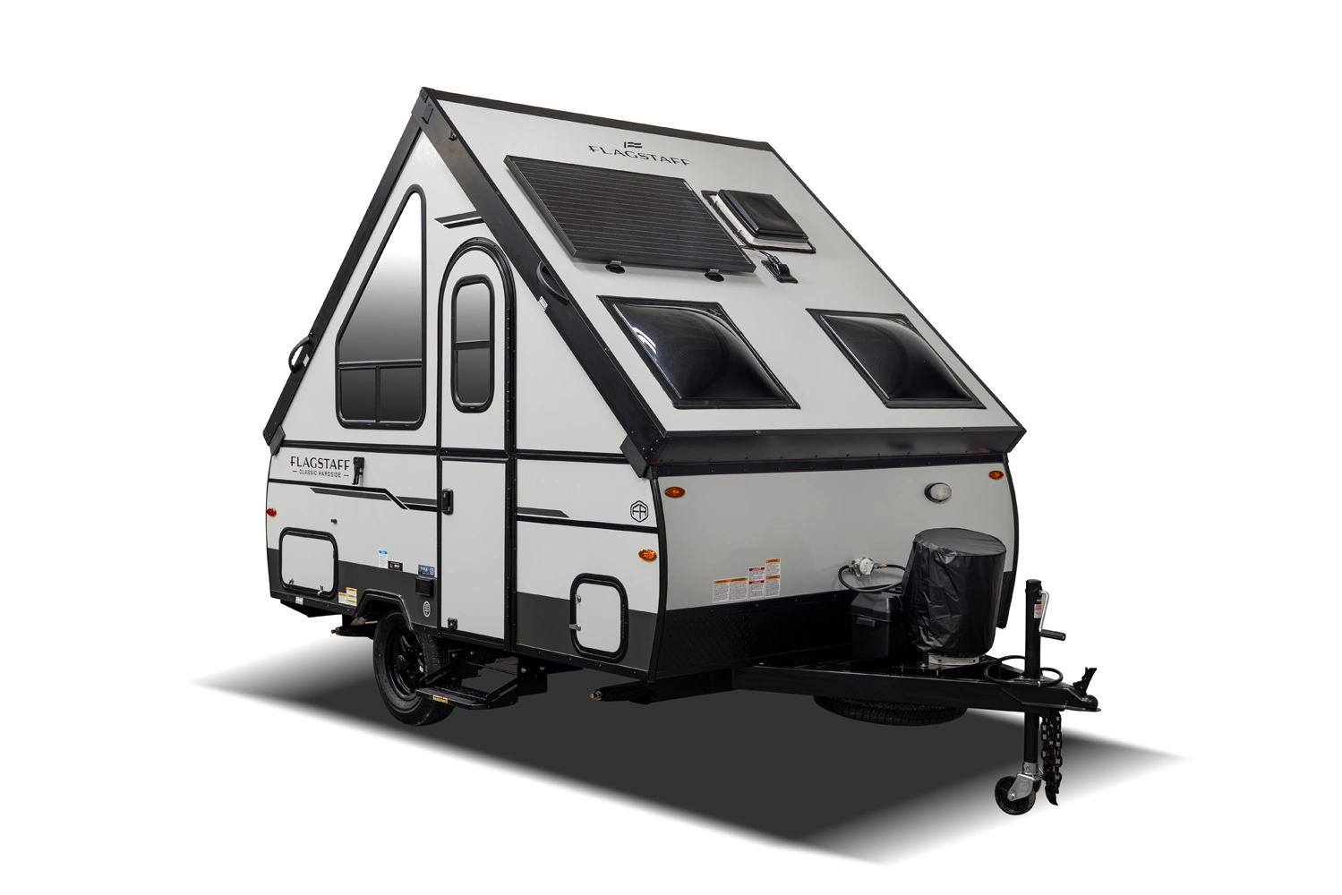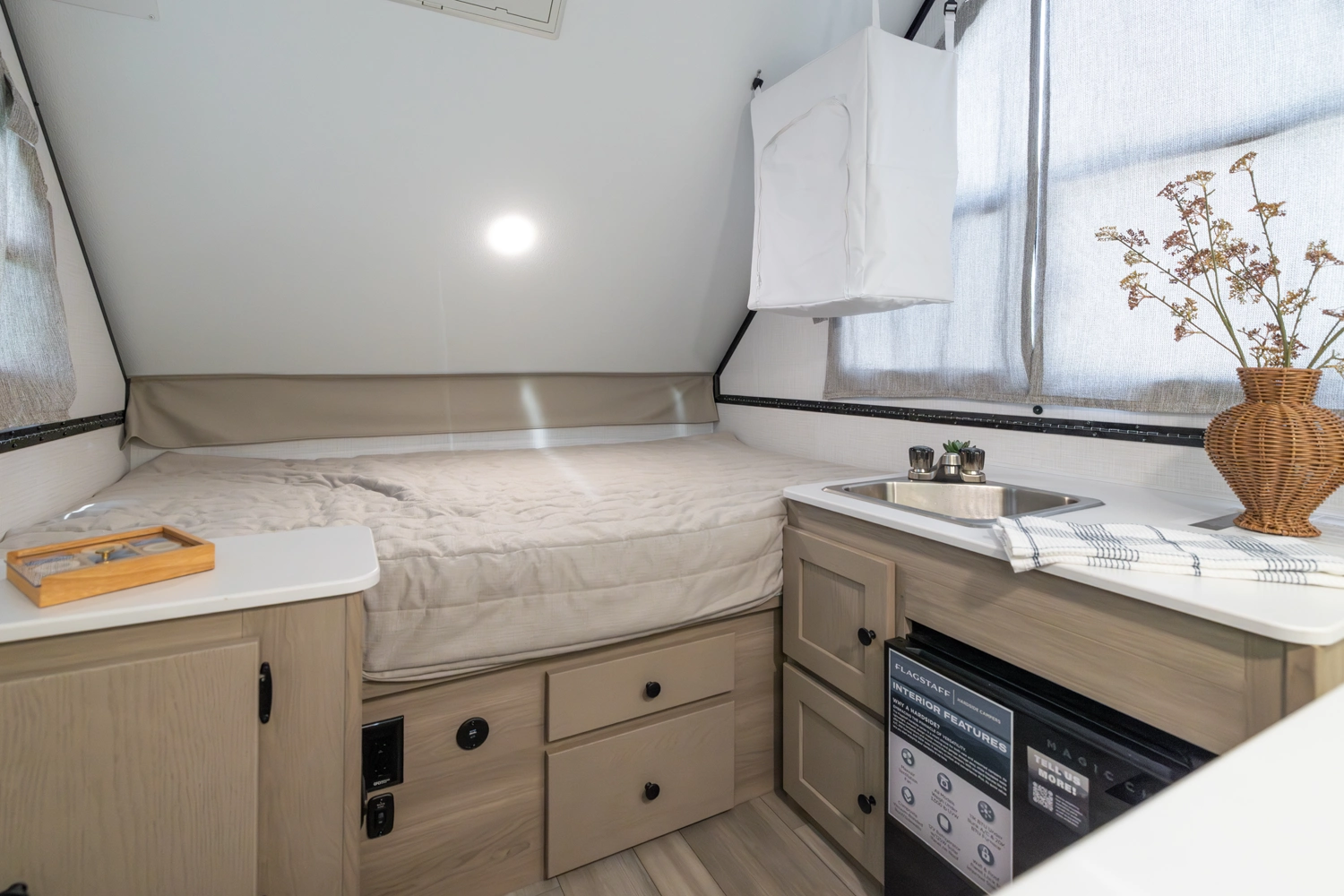 The Flagstaff T10LE is a small, traditional A-frame designed for easy, compact camping. It features a rear 54" x 80" bed, a front 33" x 80" dinette, a sink, and a refrigerator in the main area, giving you all the essentials in a compact space. With its efficient layout, it’s perfect for those who want a lightweight, easy-to-tow camper without sacrificing comfort.