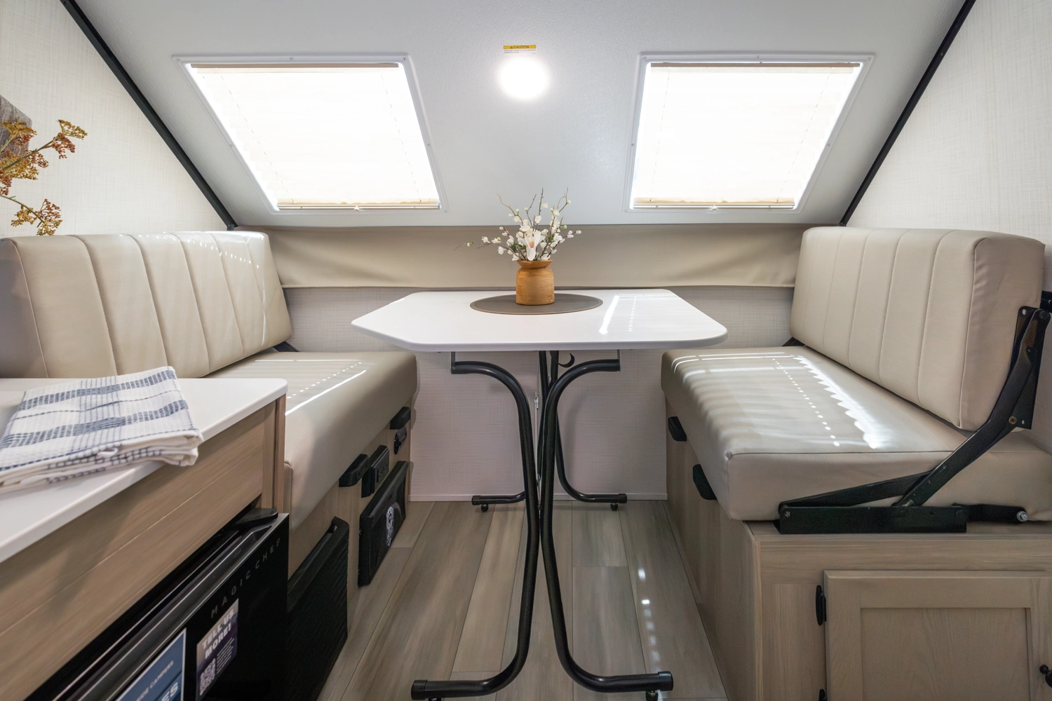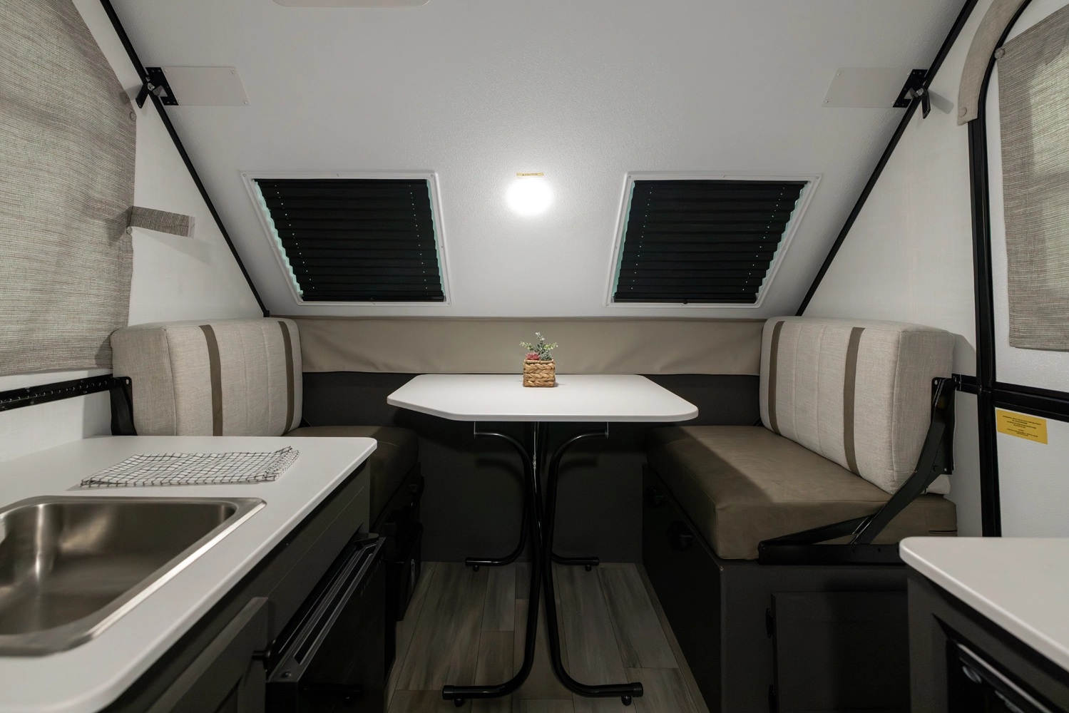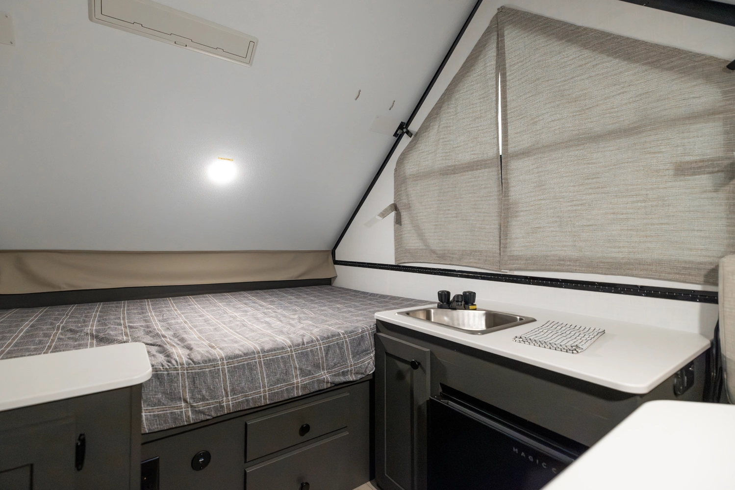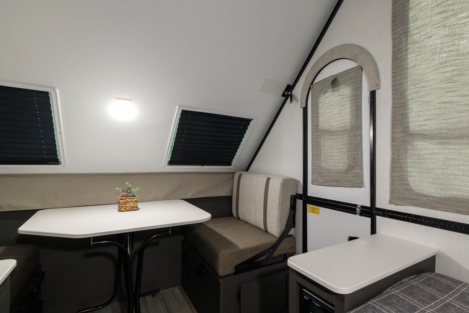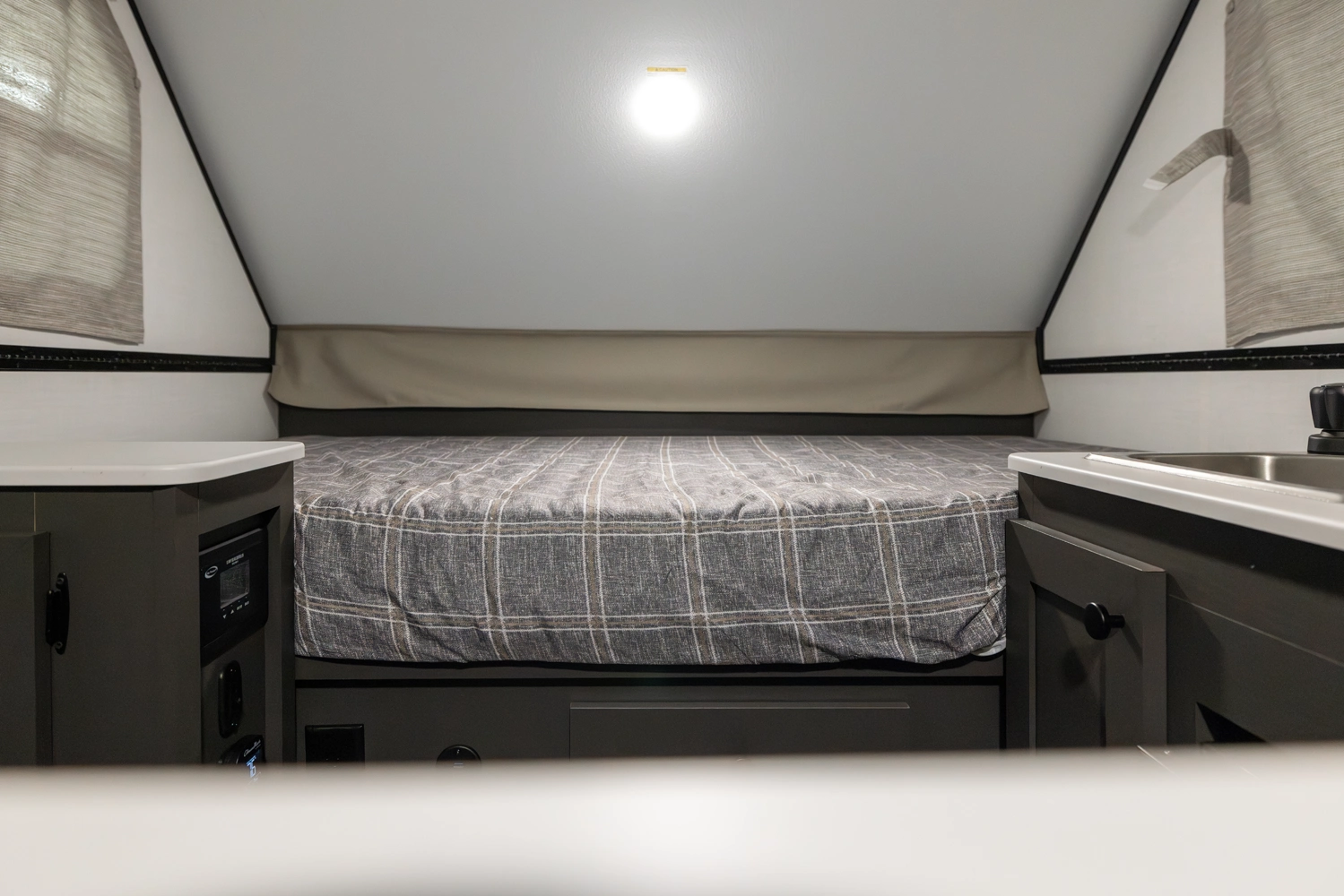 The Flagstaff T10LE is a small, traditional A-frame designed for easy, compact camping. It features a rear 54" x 80" bed, a front 33" x 80" dinette, a sink, and a refrigerator in the main area, giving you all the essentials in a compact space. With its efficient layout, it’s perfect for those who want a lightweight, easy-to-tow camper without sacrificing comfort.