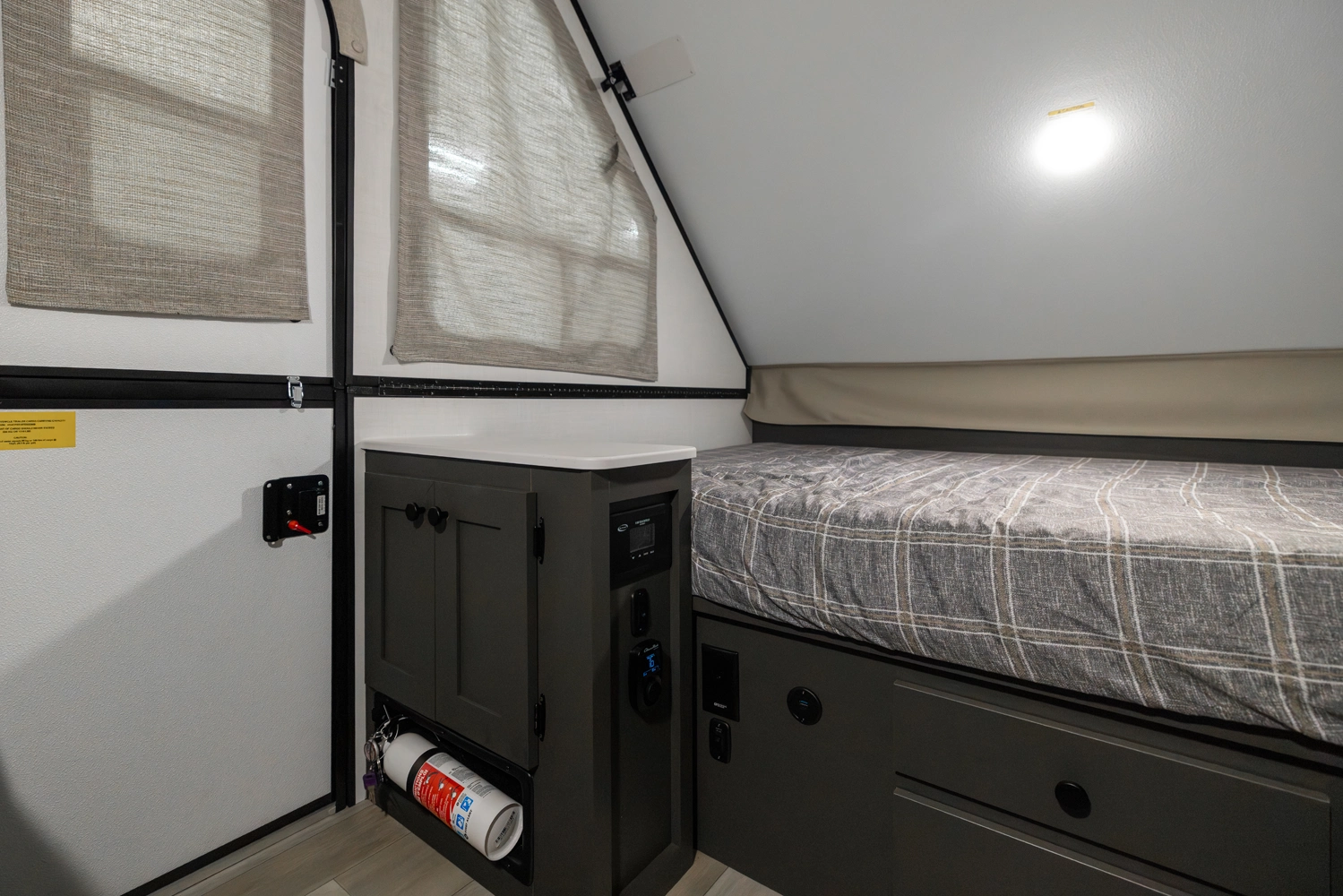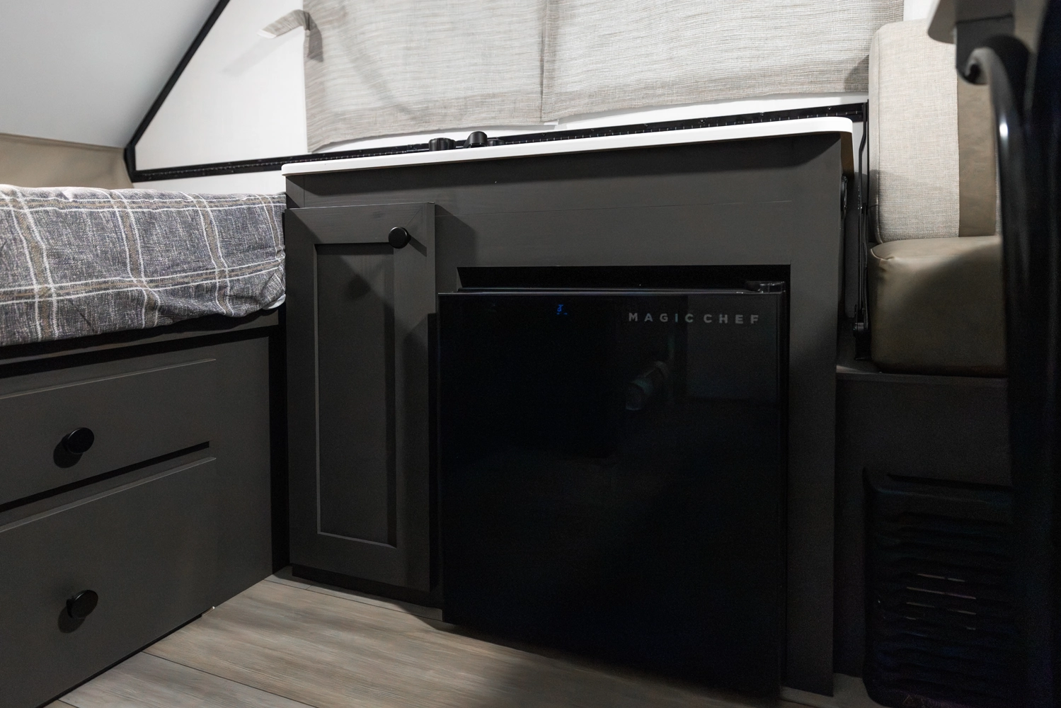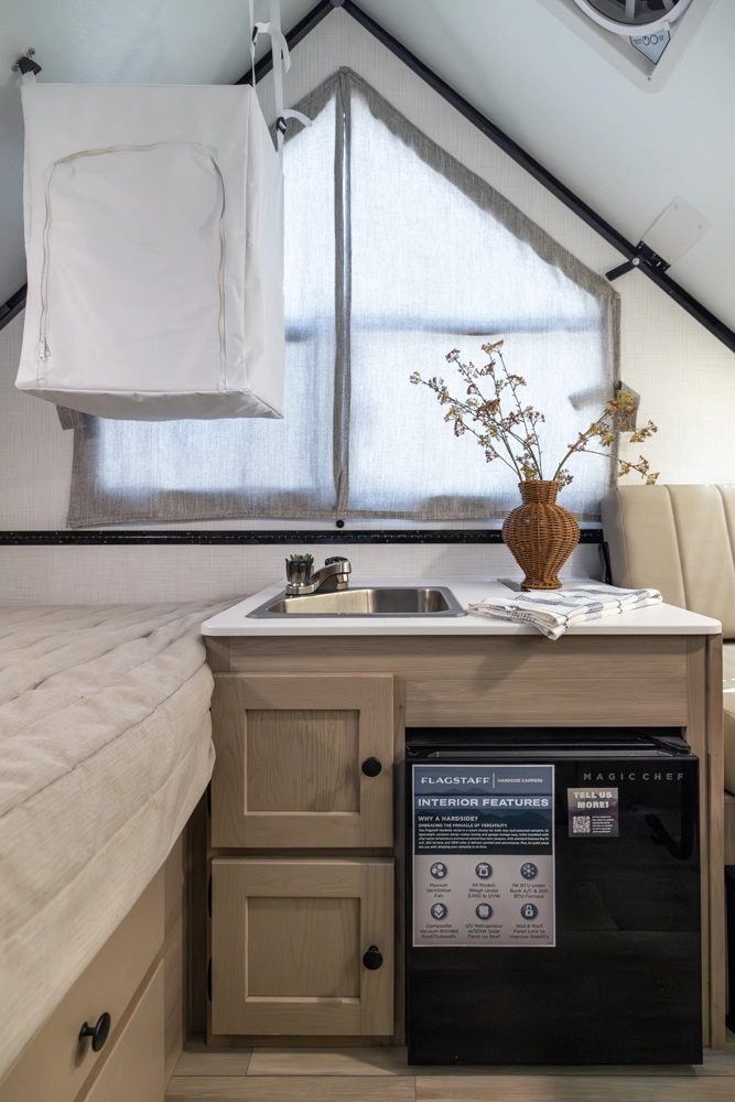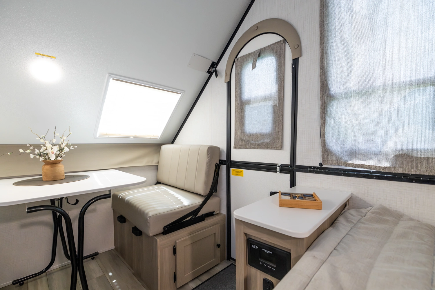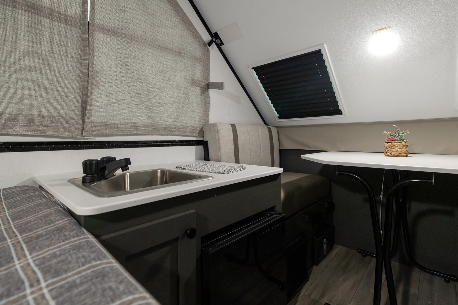The Flagstaff T10LE is a small, traditional A-frame designed for easy, compact camping. It features a rear 54" x 80" bed, a front 33" x 80" dinette, a sink, and a refrigerator in the main area, giving you all the essentials in a compact space. With its efficient layout, it’s perfect for those who want a lightweight, easy-to-tow camper without sacrificing comfort.