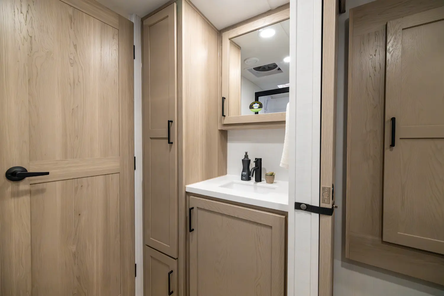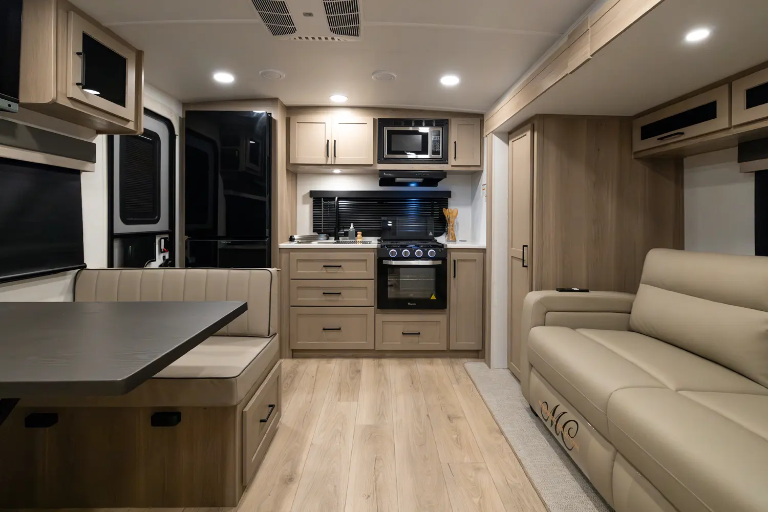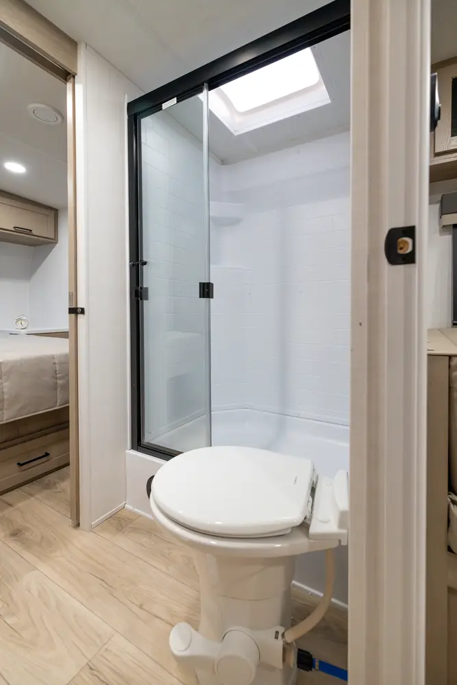 The 25SRK offers a spacious convenient layout with two entry doors providing easy access to the kitchen, bedroom, and bathroom, all while the slides are retracted. The rear kitchen features ample counter space while the living area includes a U-shaped dinette and theater seating. (optional hide-a-bed) The wardrobe slide adds generous storage making this a perfect choice for families or couples seeking flexibility and functionality on the road.