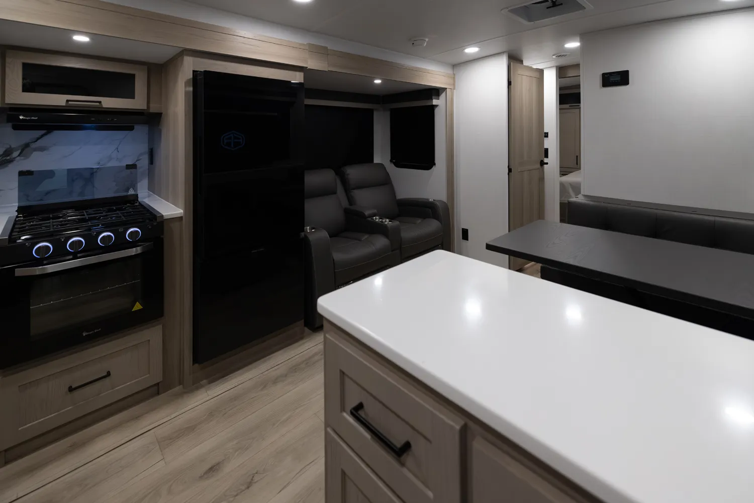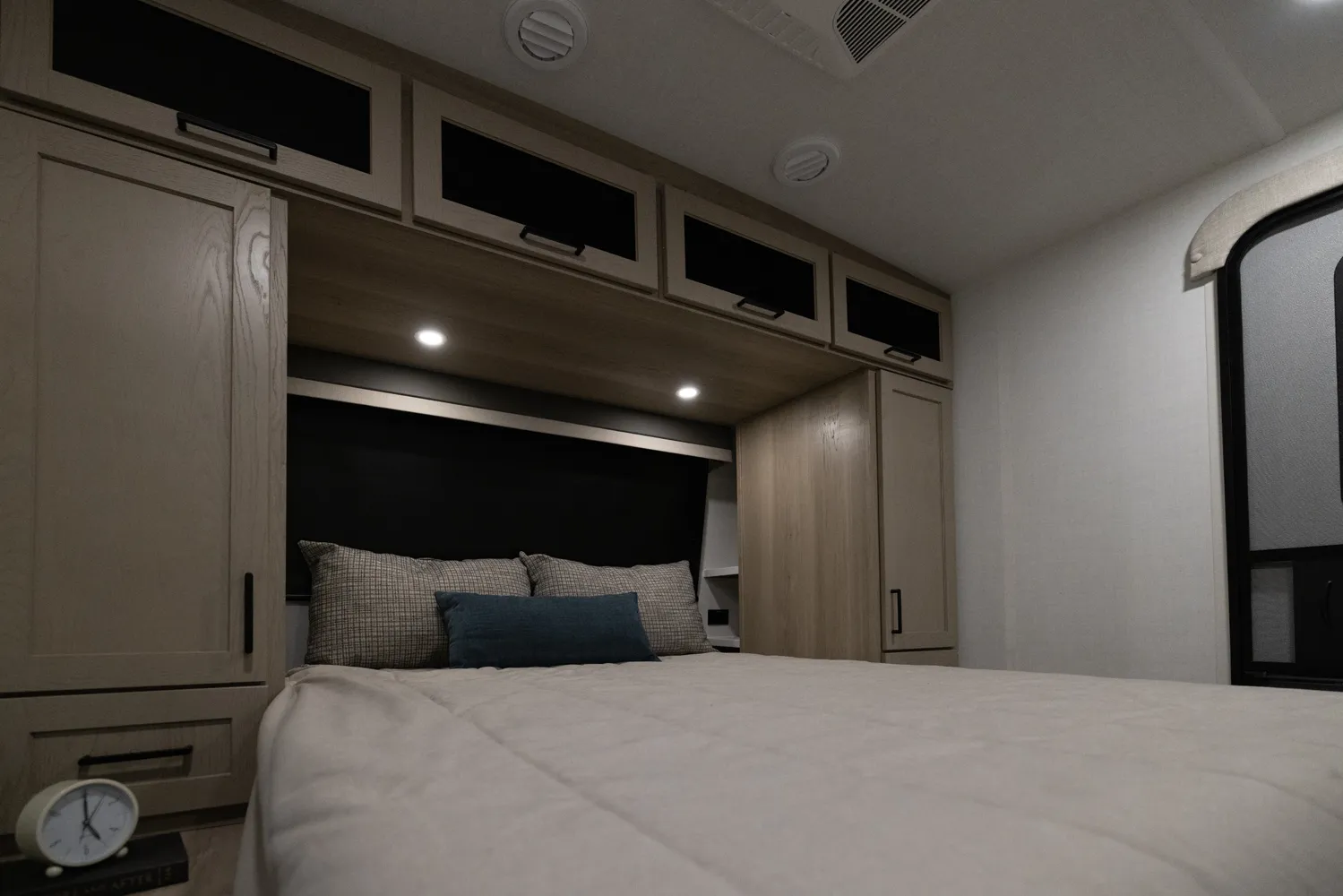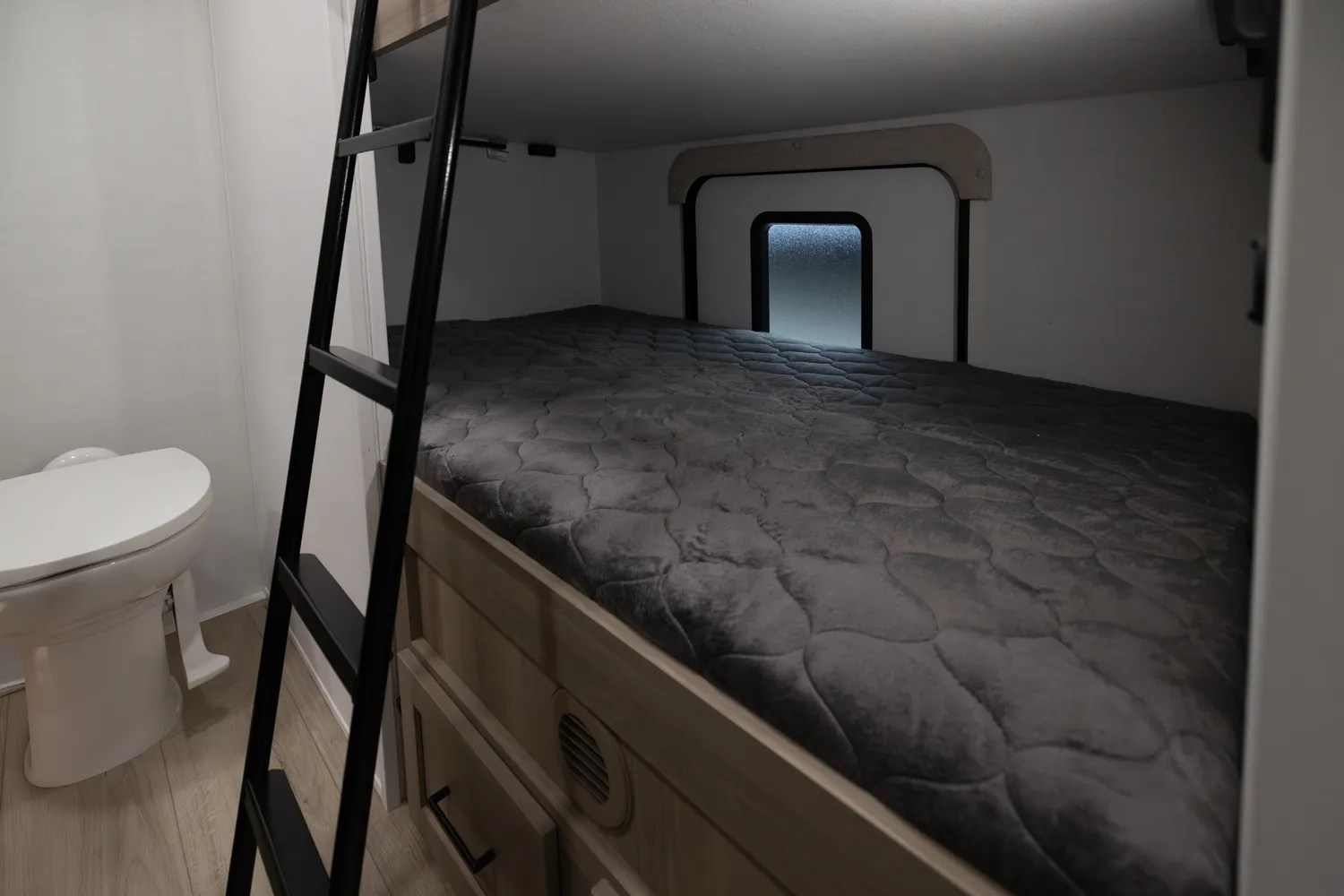 The Flagstaff 29DBH features a front bedroom with a true queen bed and a large master bathroom with shower. The spacious living area and kitchen include theater seating and a dinette for comfort and dining. A rear half-bath and segregated bunk room provide privacy and convenience, making the 29DBH ideal for families seeking versatile space and comfort on the road.