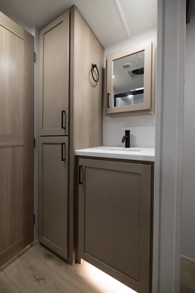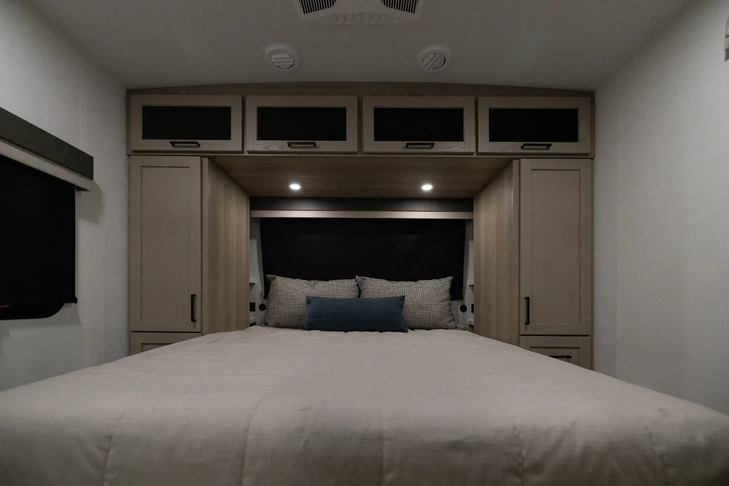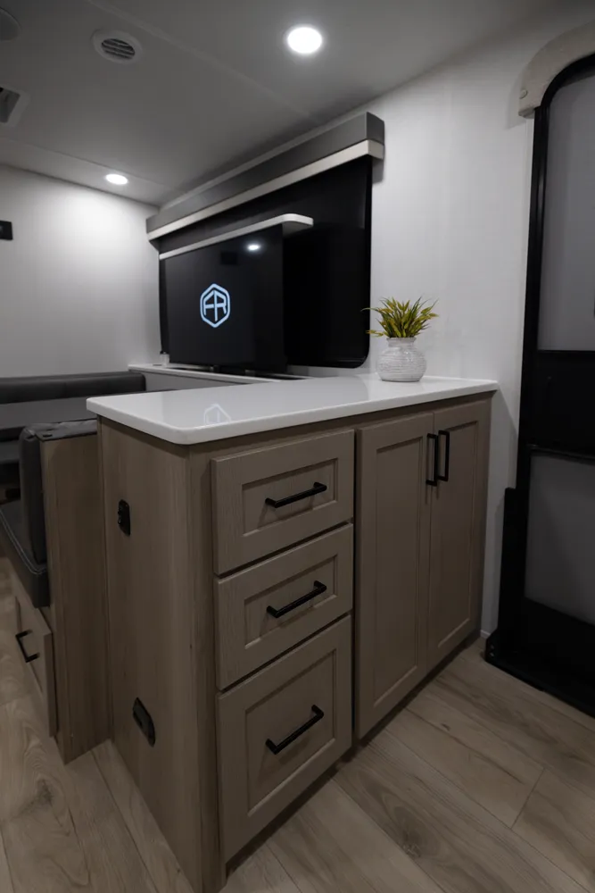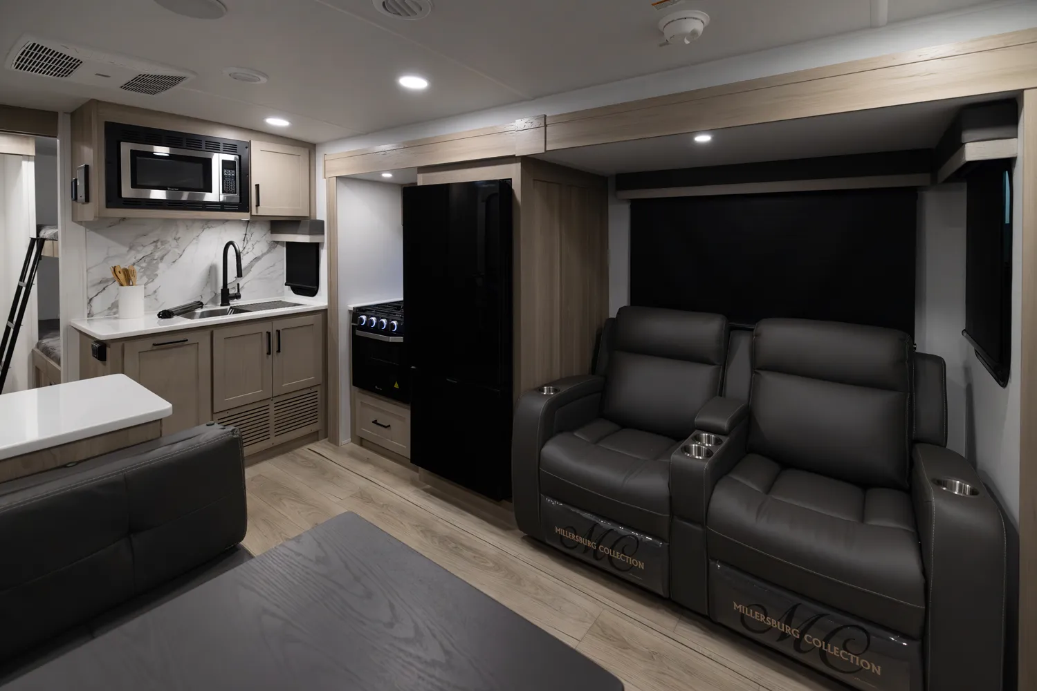 The Flagstaff 29DBH features a front bedroom with a true queen bed and a large master bathroom with shower. The spacious living area and kitchen include theater seating and a dinette for comfort and dining. A rear half-bath and segregated bunk room provide privacy and convenience, making the 29DBH ideal for families seeking versatile space and comfort on the road.