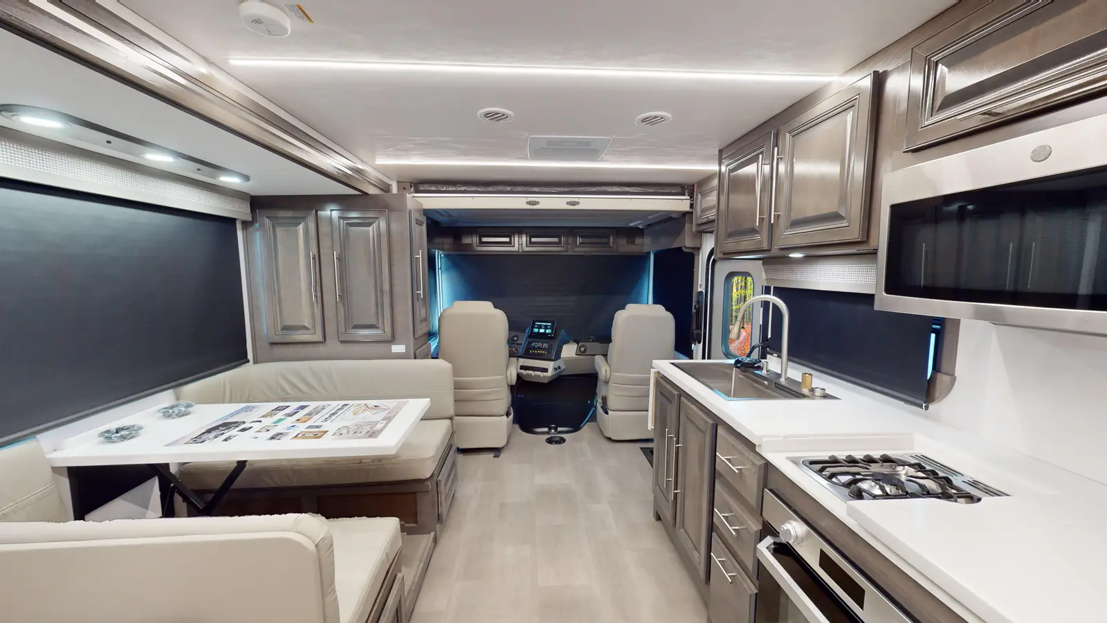 The Georgetown 36K7 by Forest River is designed for family comfort with two full baths and bunks. The kitchen features a farmhouse sink, 3-burner cooktop, microwave, and residential refrigerator. Enjoy entertainment in the theater seats across from a TV. The mid-ship full bath is across from the bunk beds. The bedroom offers a king bed and optional washer/dryer, plus a full master bath. The cab features swivel captain seats, a table, and a power overhead bunk.