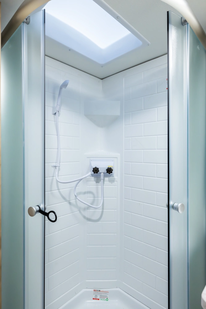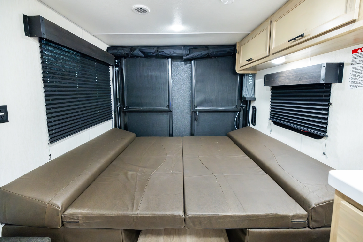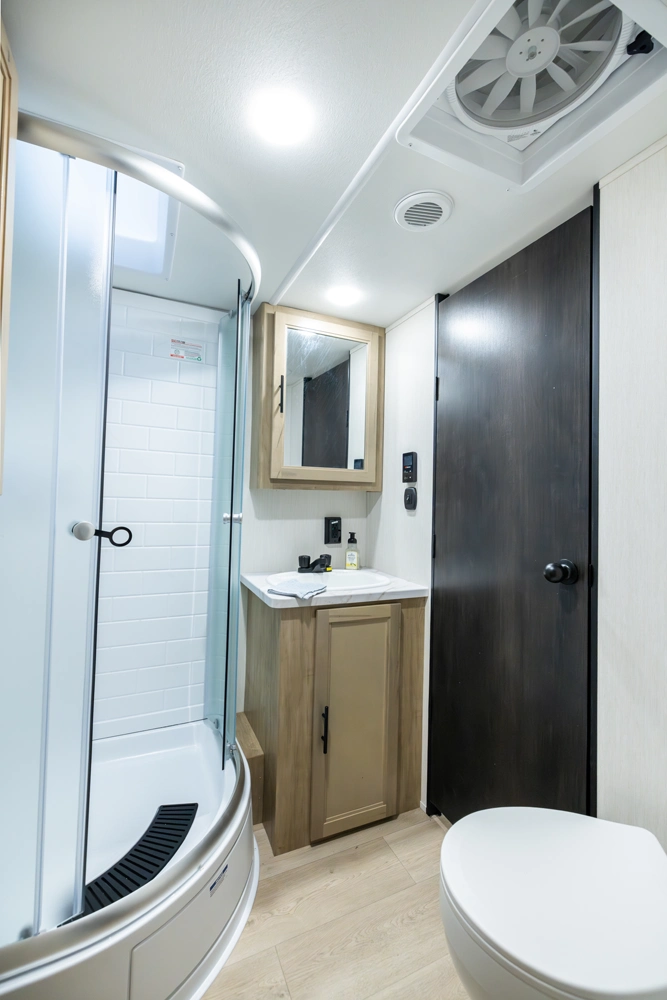 The Grey Wolf Toy Hauler by Forest River is the perfect RV for outdoor enthusiasts. The spacious garage can accommodate your toys, while the outdoor kitchen, shower, and patio area provide the ultimate outdoor living experience. Inside, you'll find a luxurious bedroom with a walk-around queen bed and a well-appointed bathroom. The modern kitchen, with its black stainless steel farm sink and sink cover, is perfect for cooking and entertaining.
