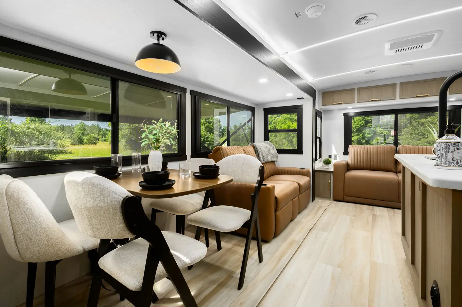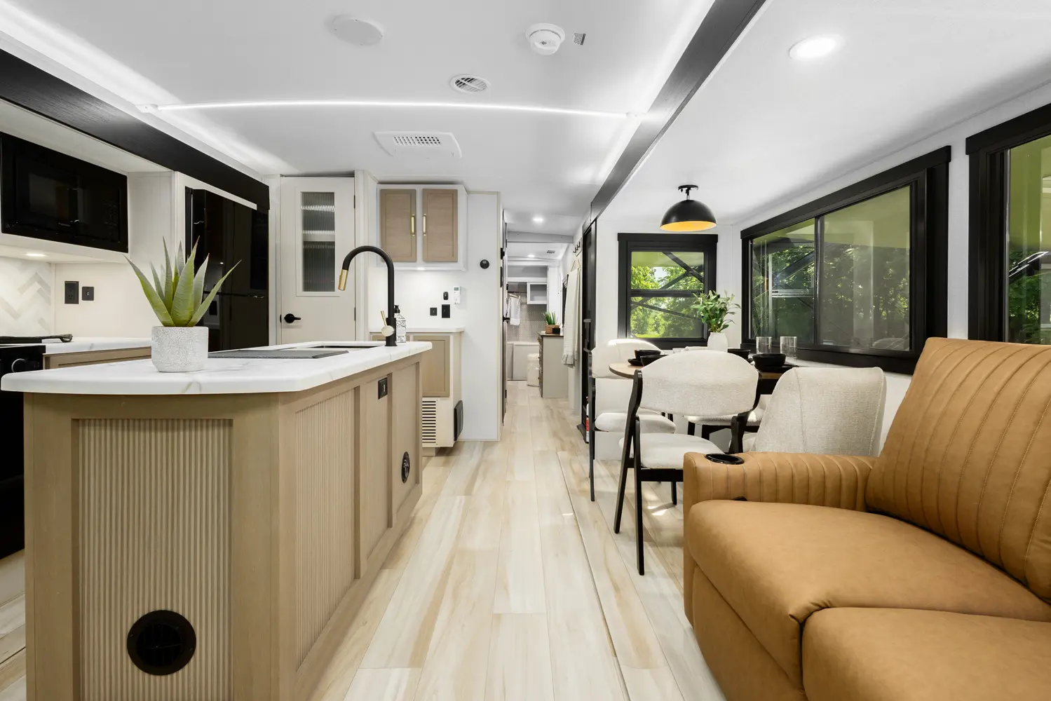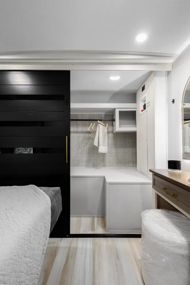 Touting 3 slide-outs, the 308RL is the most spacious Hemisphere Travel Trailer for coupes. Enjoy a breath-taking view of your campsite in the living room or relax in the wide-open bedroom. Past the bedroom you'll find a WALK-IN wardrobe, and washer/dryer prep area spacious enough for separate washer & dryer. (This is the only model without a windshield, because we didn't think your laundry would care to see outside).