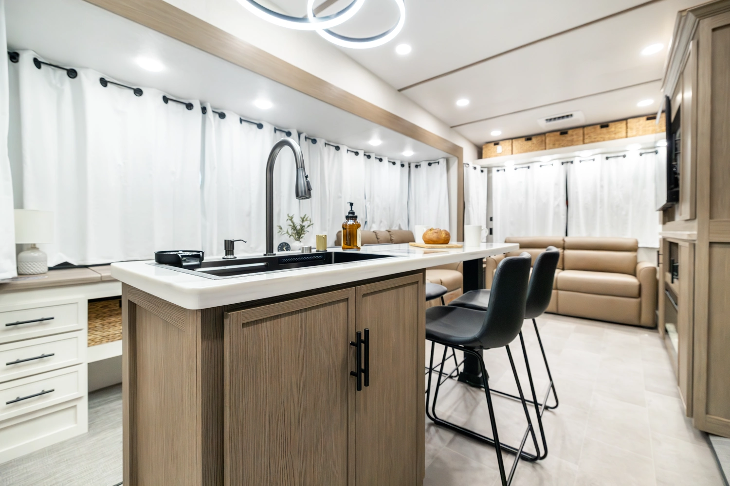 • Deep Single Bowl Task Sink Including High-Rise Pull-Down Faucet Sprayer, Waterfall Faucet, Glass Washer, Soap Dispenser, Countertop Strainer Control, Colander, Task Basket, Cutting Board