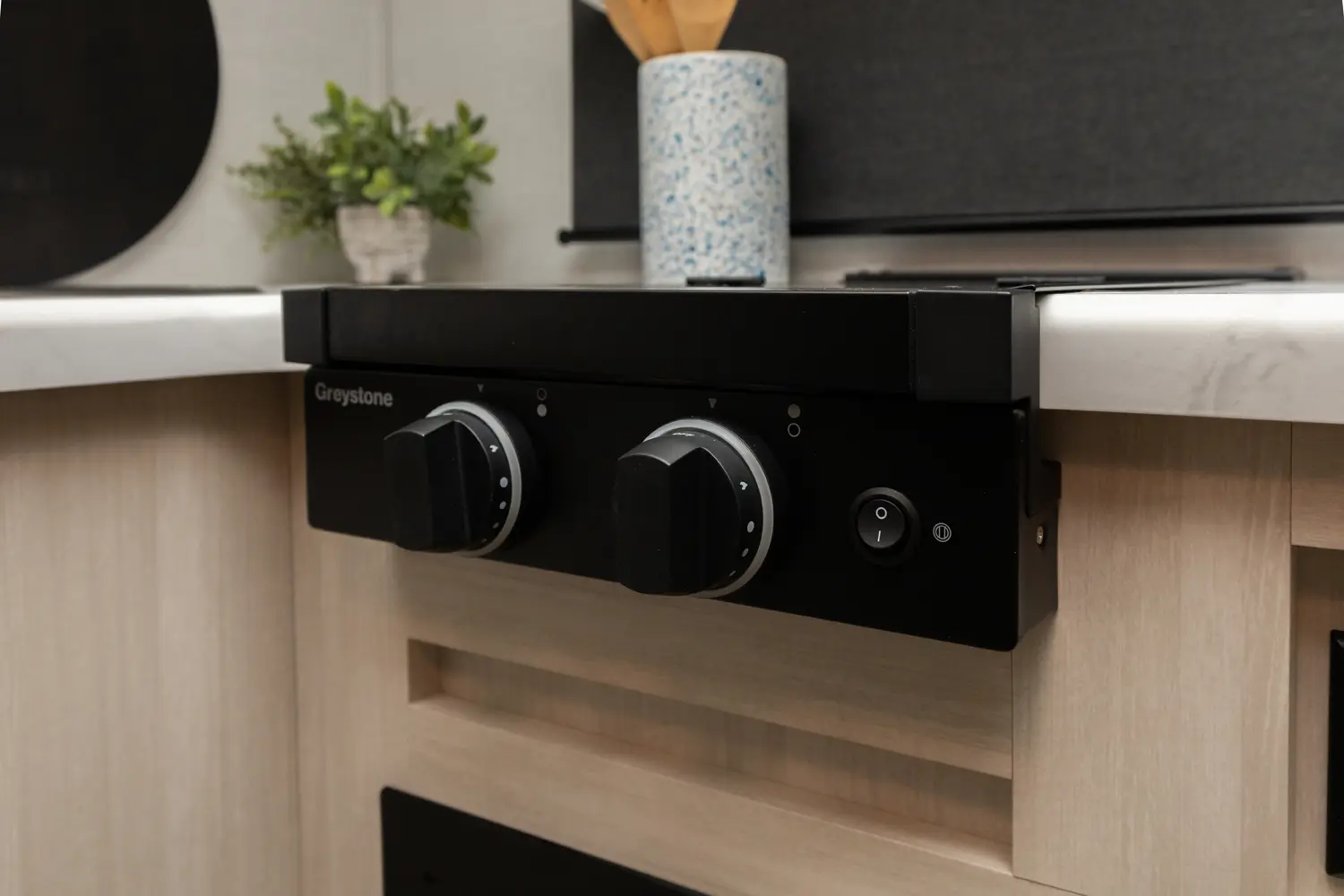 The RP-198 offers lightweight towing with a smart, efficient layout. A private front queen bed provides restful nights, while a pass-through bath is accessible from both the bedroom and main living area for convenience and privacy. The kitchen and dinette area make meal prep and dining easy, with ample storage and modern finishes throughout. Ideal for couples or small families seeking comfort on the road.