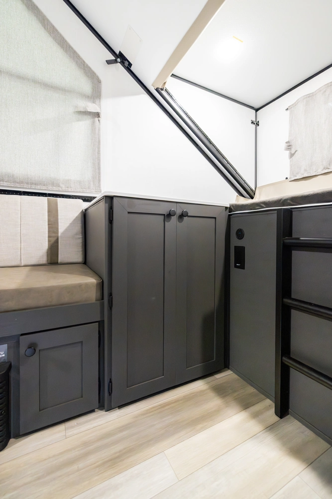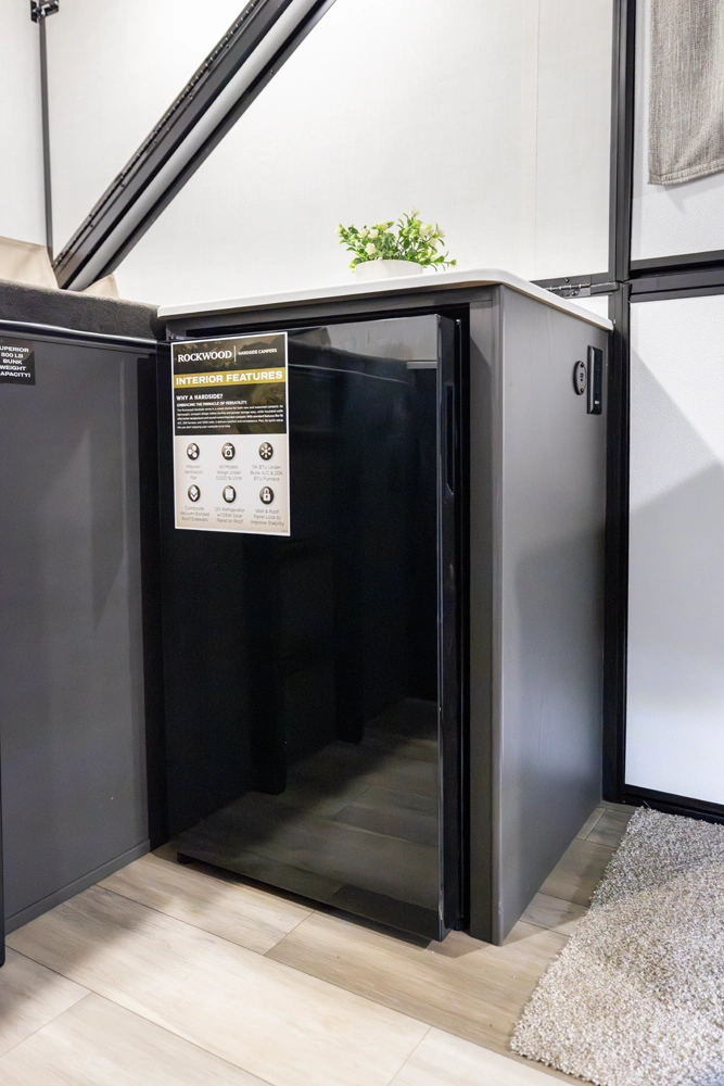 The Rockwood Hard Side A216HS combines compact convenience with smart design. Its front dormer increases headroom while housing a comfortable bunk bed, while the rear gaucho easily converts for relaxing or sleeping. Inside you’ll also find a convenient wet bath, a sink, and a small refrigerator—making this hard side camper a practical and comfortable choice for easy adventures.