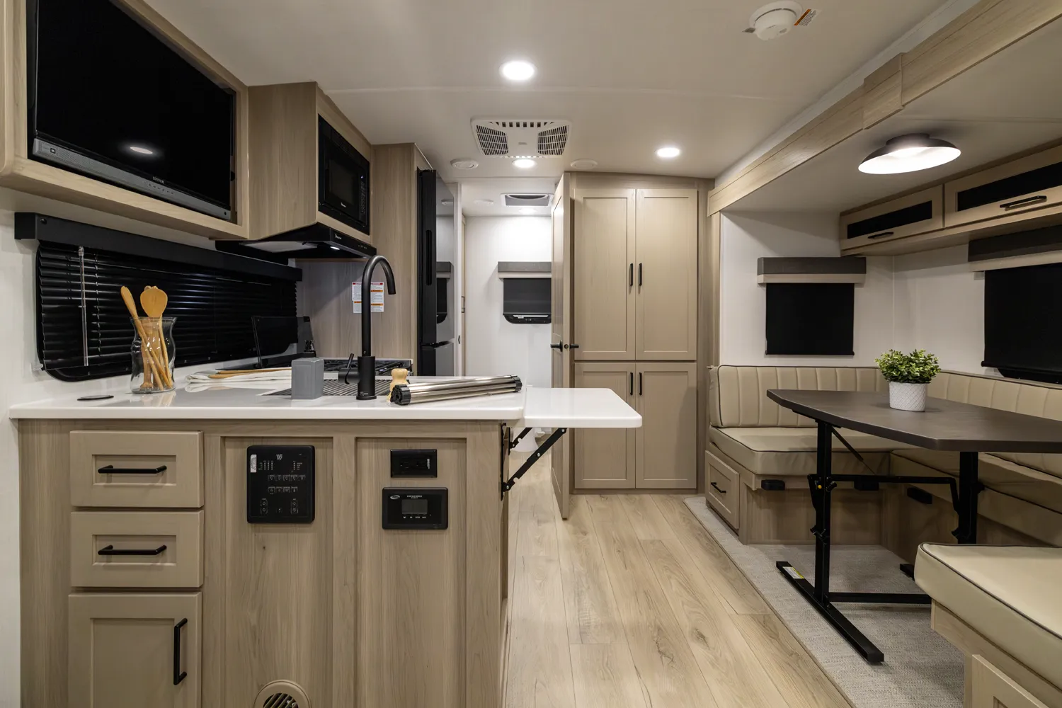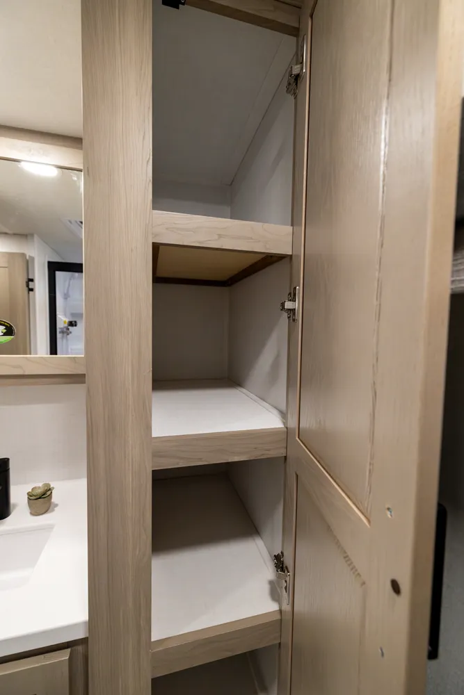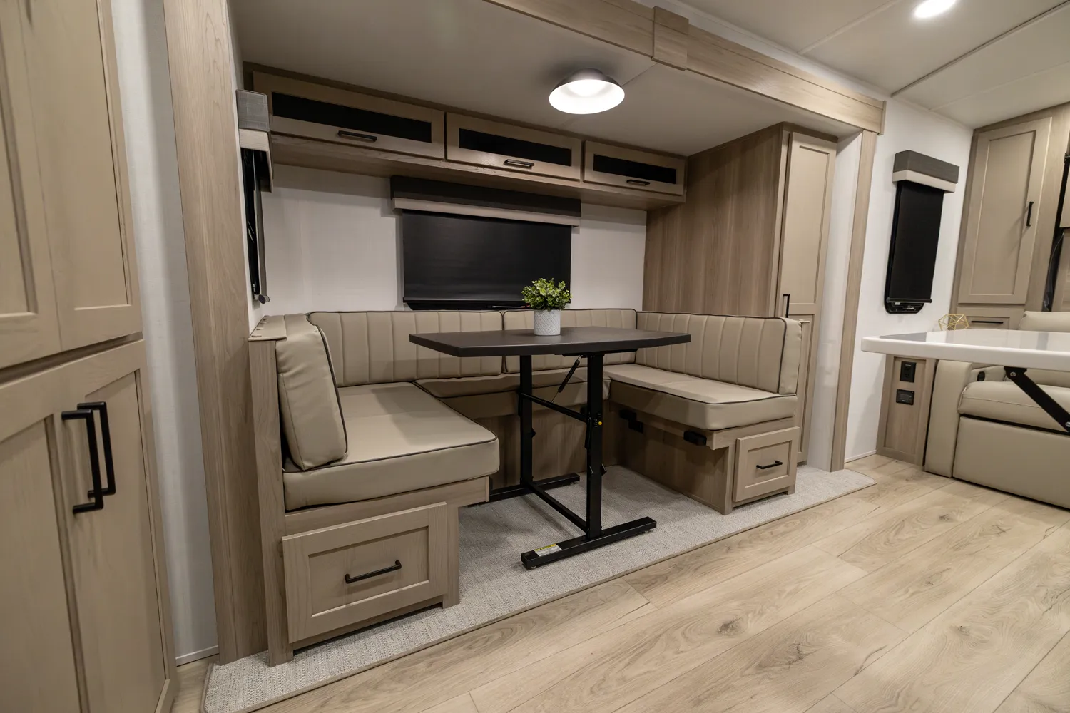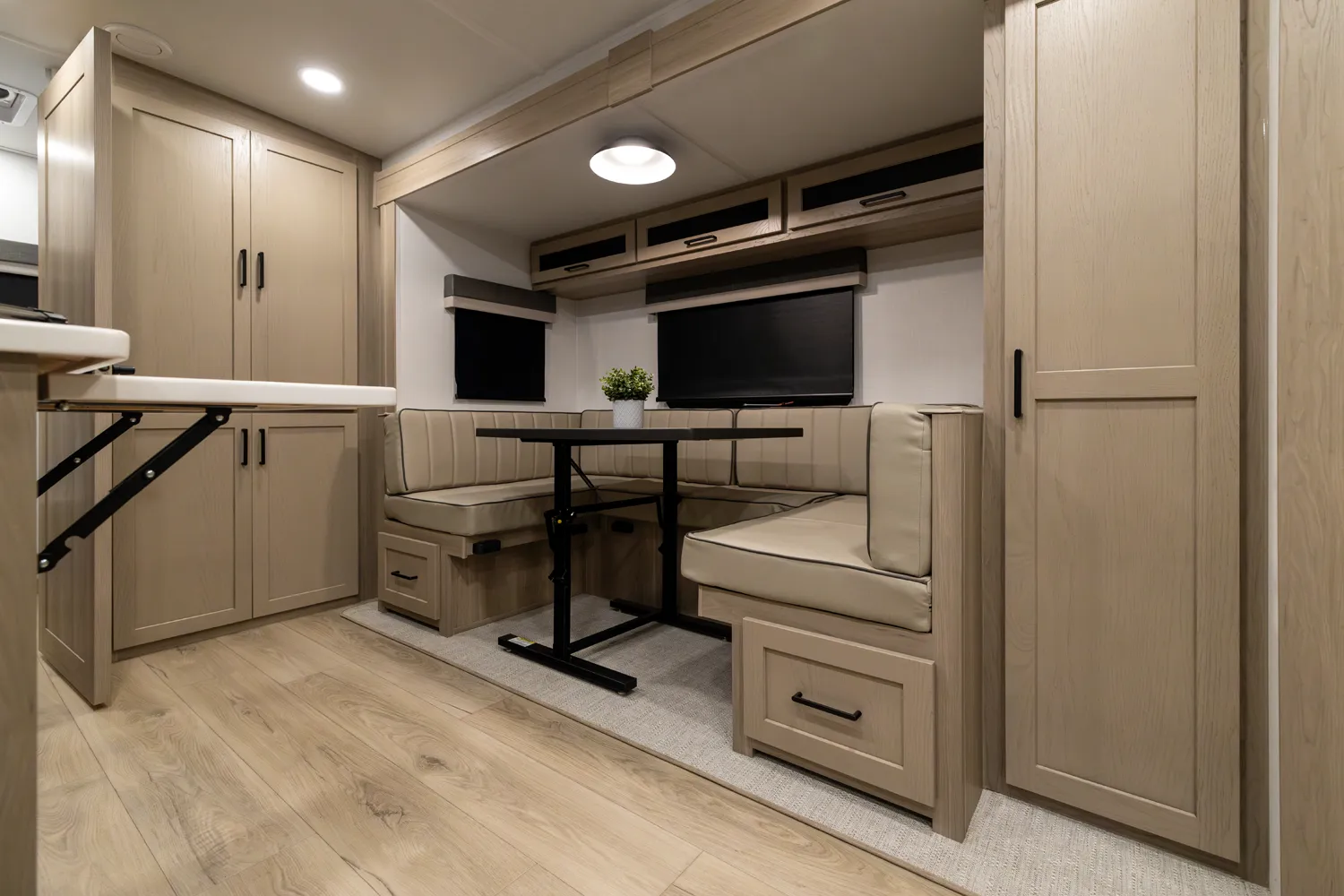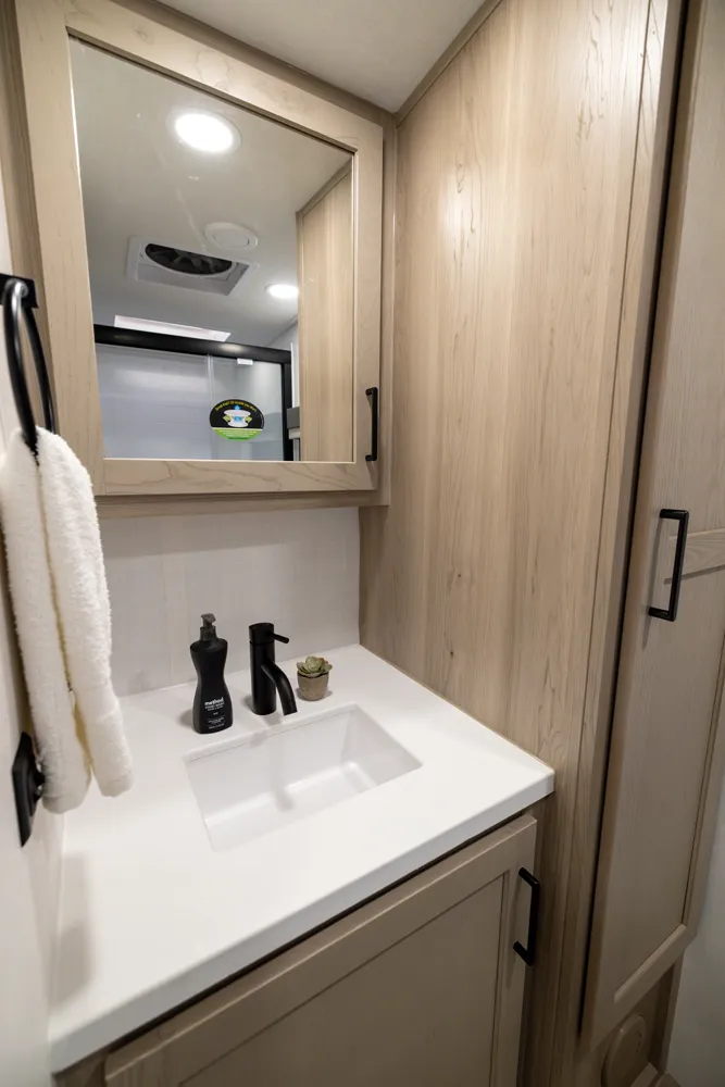 The 2214S delivers a smart, comfortable layout with a front Murphy bed that maximizes living space by day and provides a restful sleep at night. The U-shaped dinette offers plenty of room for meals, games, or extra sleeping space when needed. A large rear bathroom with a rectangular shower adds everyday comfort and convenience making this floor plan a great choice for couples or small families who want big features in a compact trailer.