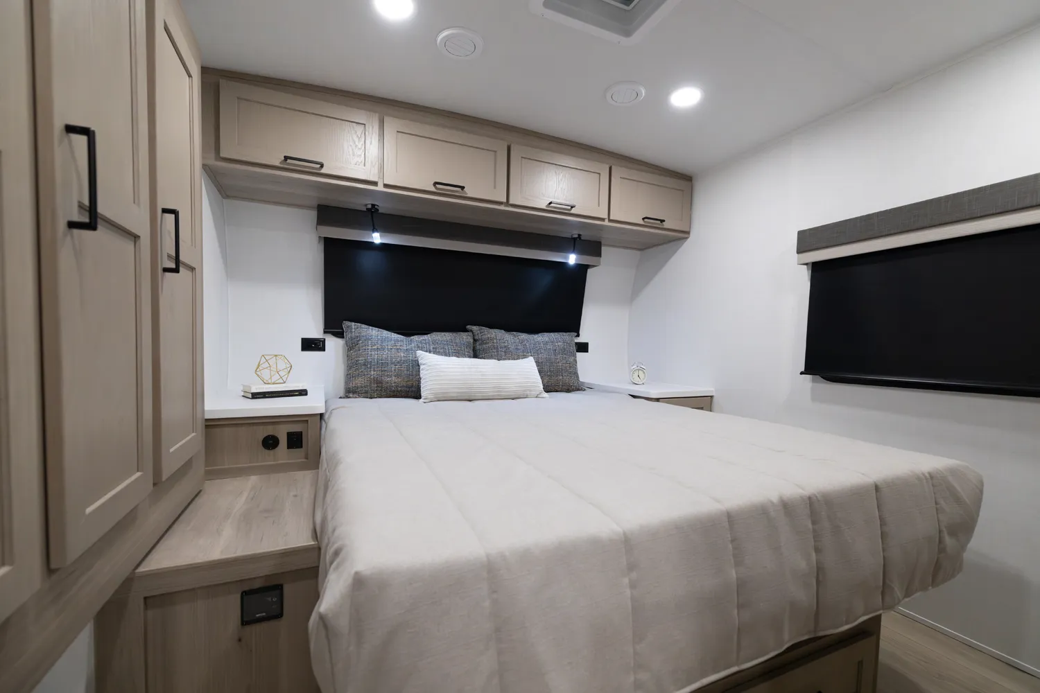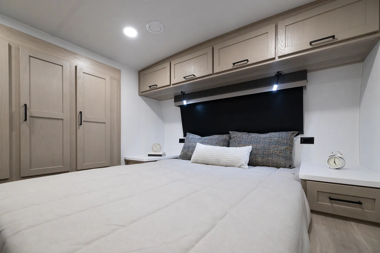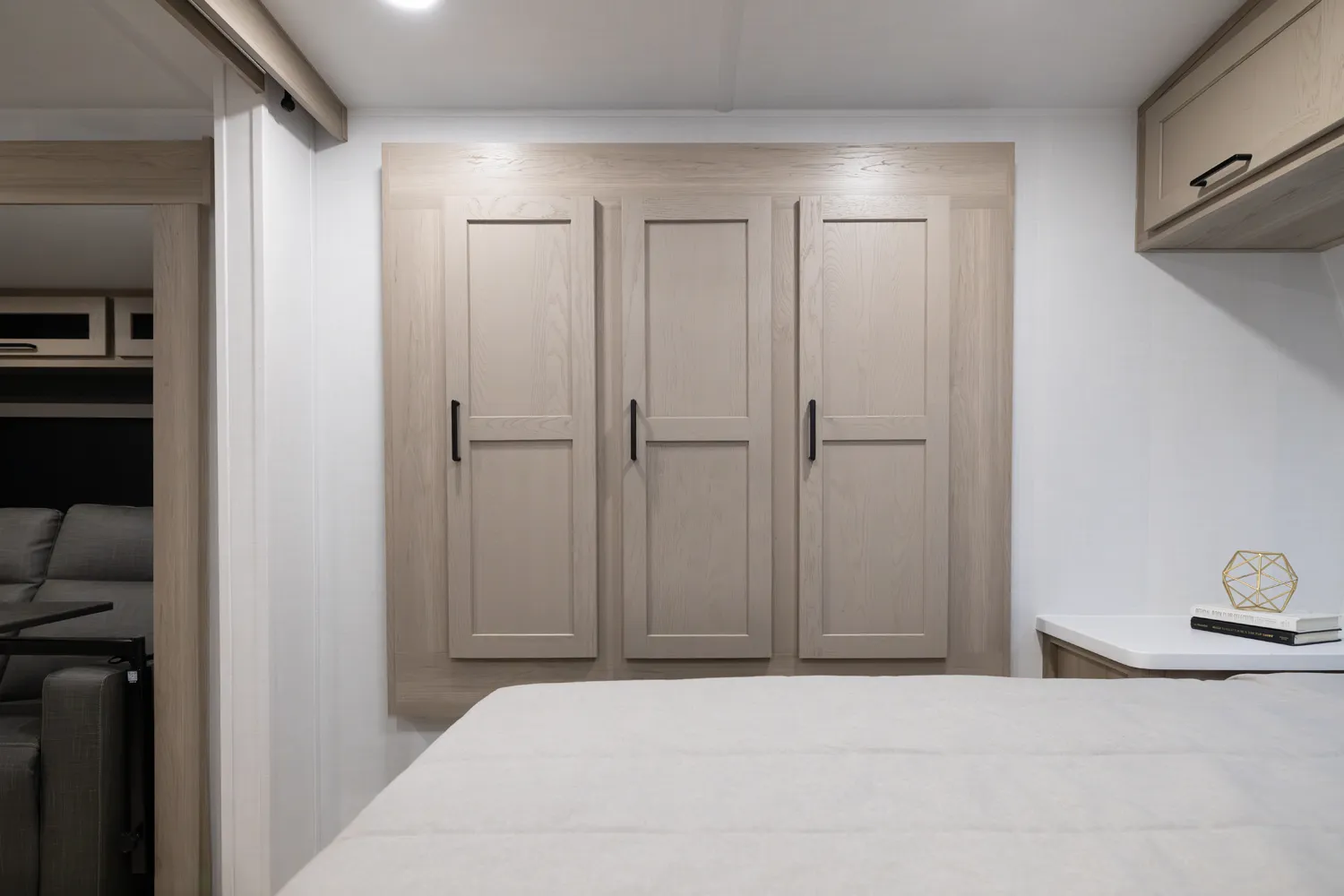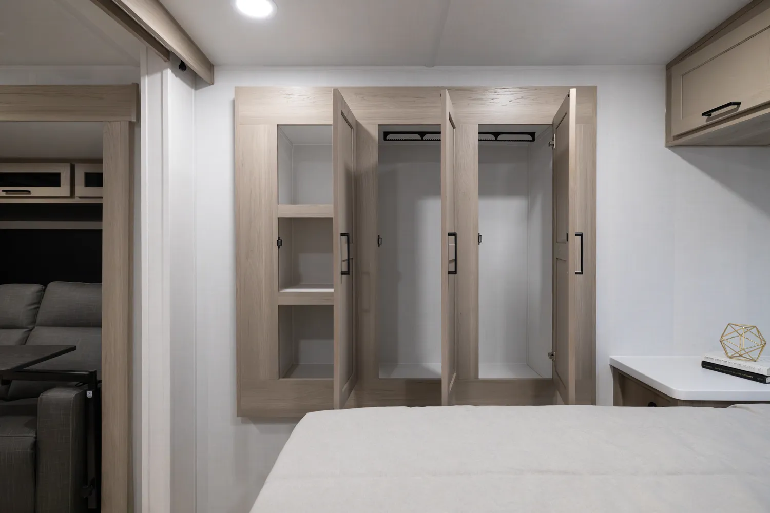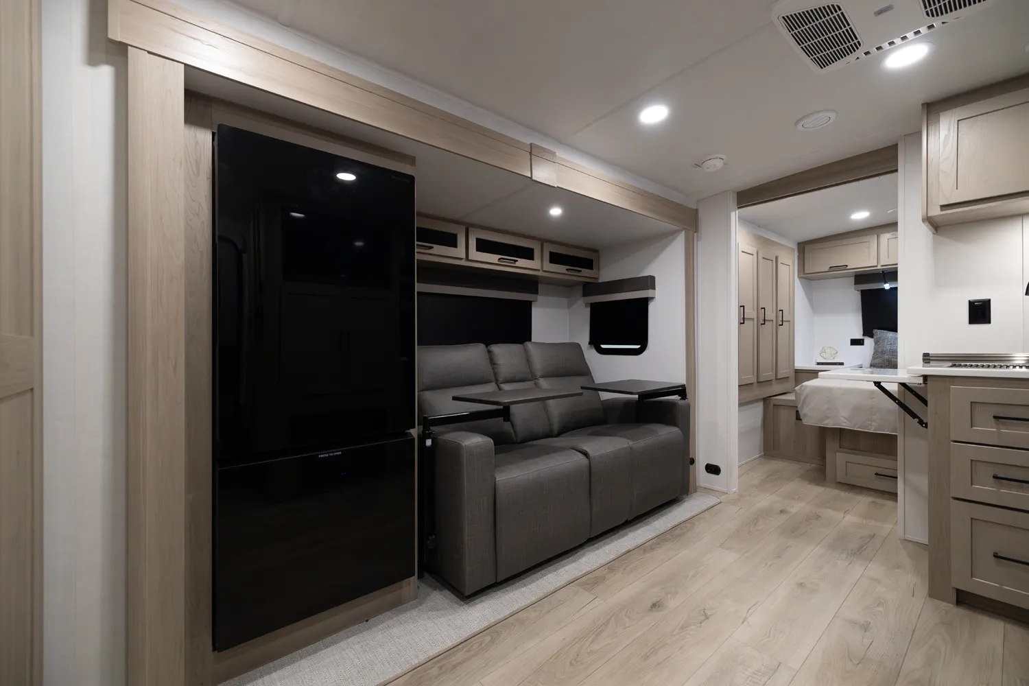 This unit is unique with its big 36" sliding doors leading to the bathroom and bedroom. These doors make moving around for a broad-shouldered person easier and comfortable. The entertainment center is loaded with 32" tv, a residential-style soundbar and a fireplace space heater. Across from this lovely entertainment center is a 72" theatre seating which is perfect for reclining and watching a good movie.