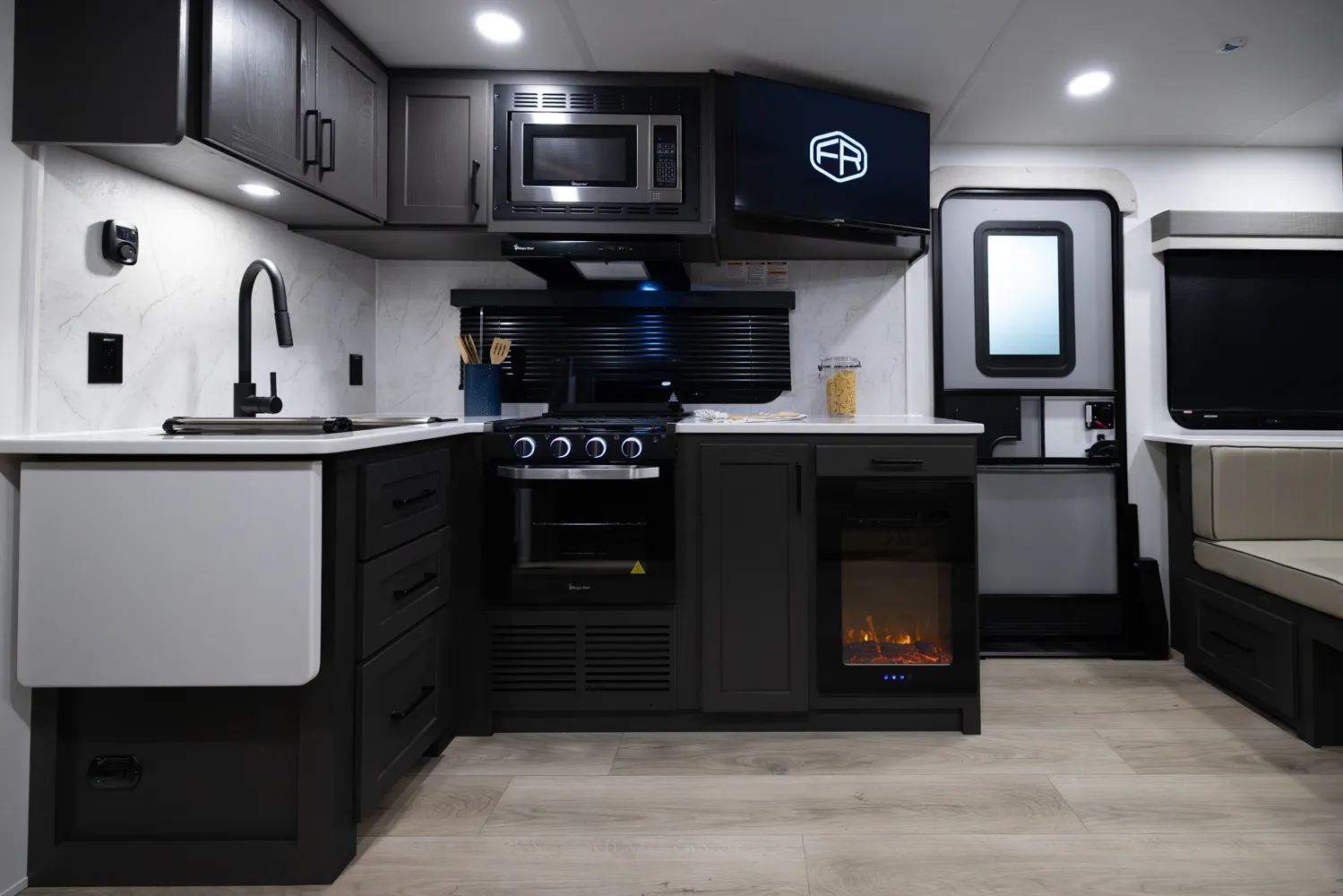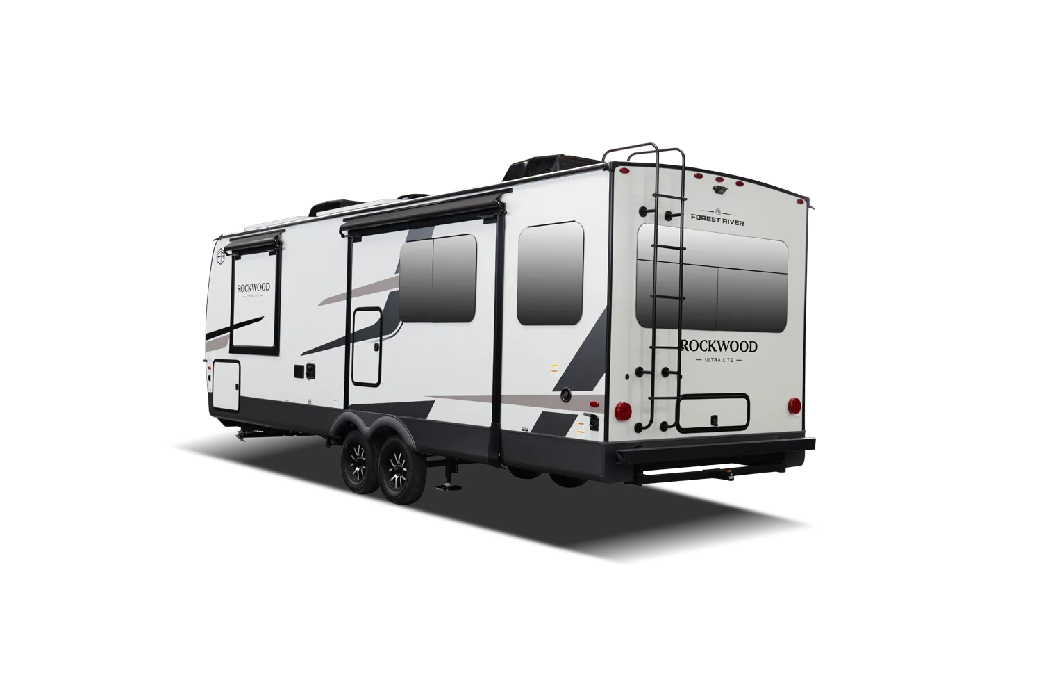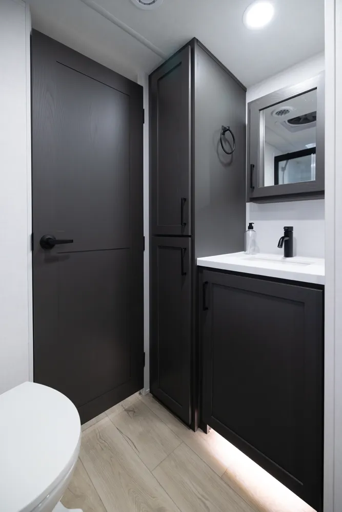 The 2618RD features a front bedroom with a true queen bed and wardrobe slide. Two entry doors provide easy access to the bedroom, large pass-through bathroom, and kitchen even when slides are in. The rear U-shaped dinette and 67" theater seat create a spacious, comfortable living area, making the 2618RD perfect for couples or small families.