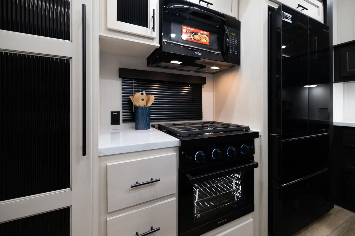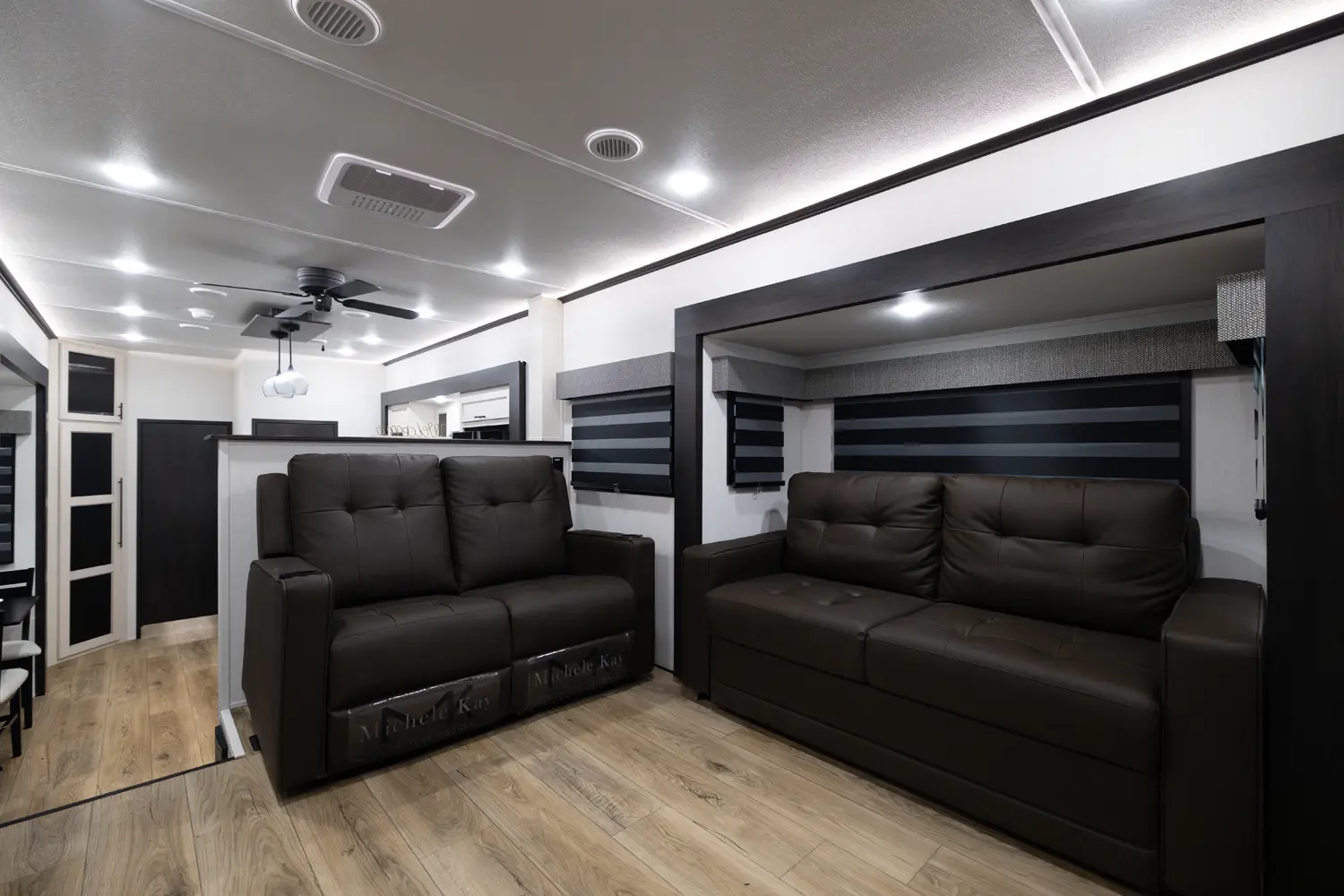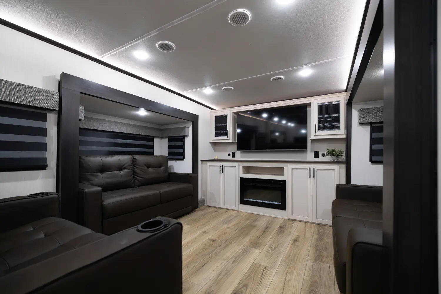 Discover the Forest River Sabre 37FLH, a luxurious 5th wheel RV designed for entertaining! This stunning front living room layout is perfect for movie nights or extra sleeping space, featuring two tri-fold sleeper sofas. The private owner’s suite includes a spa-like full bathroom, while a convenient half-bath adds extra functionality. The chef-inspired kitchen boasts premium solid surface countertops, a 12-volt fridge, air fryer microwave, large oven, and handcrafted real wood cabinetry.