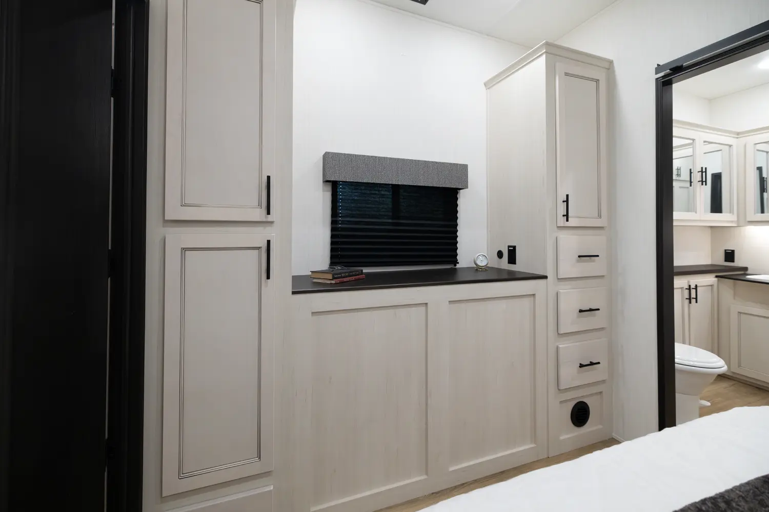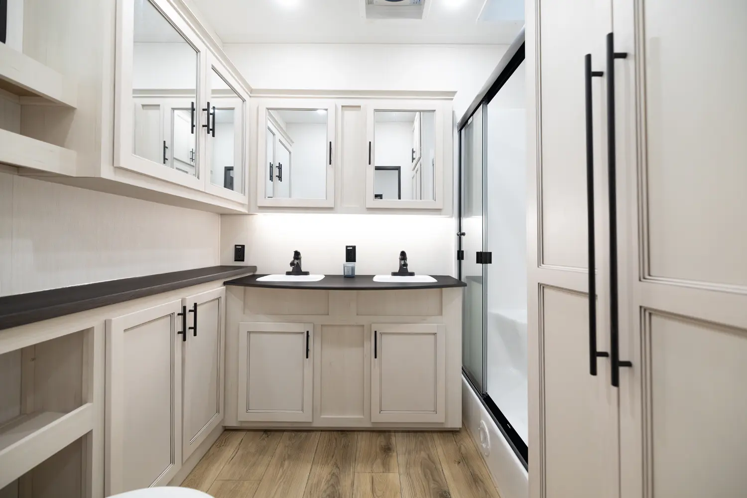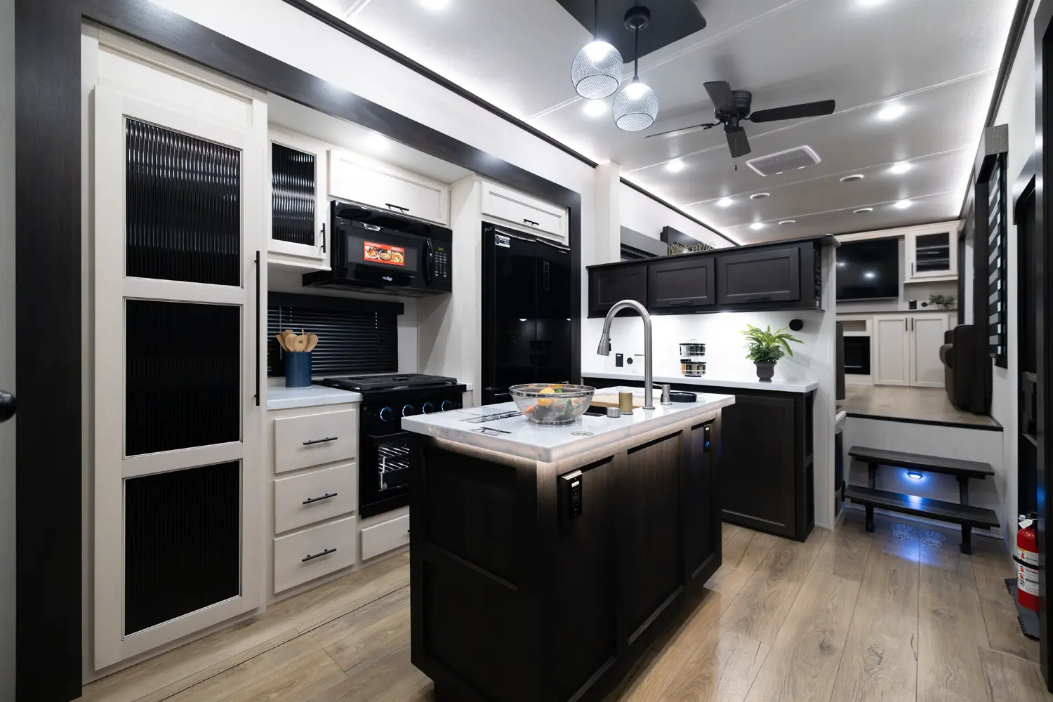 Discover the Forest River Sabre 37FLH, a luxurious 5th wheel RV designed for entertaining! This stunning front living room layout is perfect for movie nights or extra sleeping space, featuring two tri-fold sleeper sofas. The private owner’s suite includes a spa-like full bathroom, while a convenient half-bath adds extra functionality. The chef-inspired kitchen boasts premium solid surface countertops, a 12-volt fridge, air fryer microwave, large oven, and handcrafted real wood cabinetry.