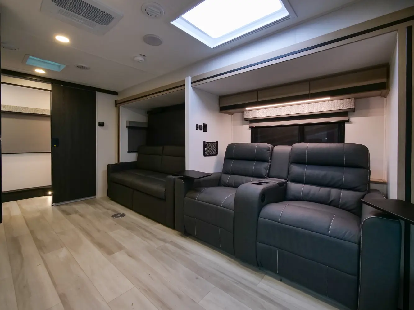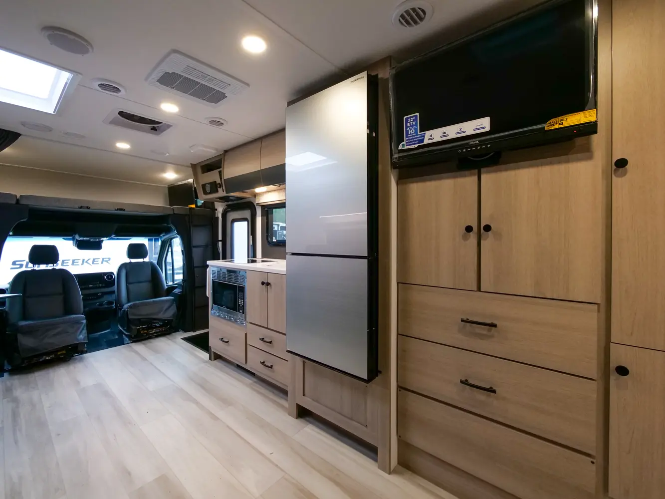 The 2400T is the perfect couple's coach, with a full rear bathroom, galley kitchen, and queen Murphy bed/sofa combo. There's a 54" x 80" cab over bunk for additional sleeping and storage space—or you can choose to add the optional Trekker cap with a built in entertainment center. This unit features a hidden storage area behind the 12V TV. And you never know when someone might sleep on the power theater seats. The 2400T is built on the Mercedes Benz Diesel 3500 chassis.