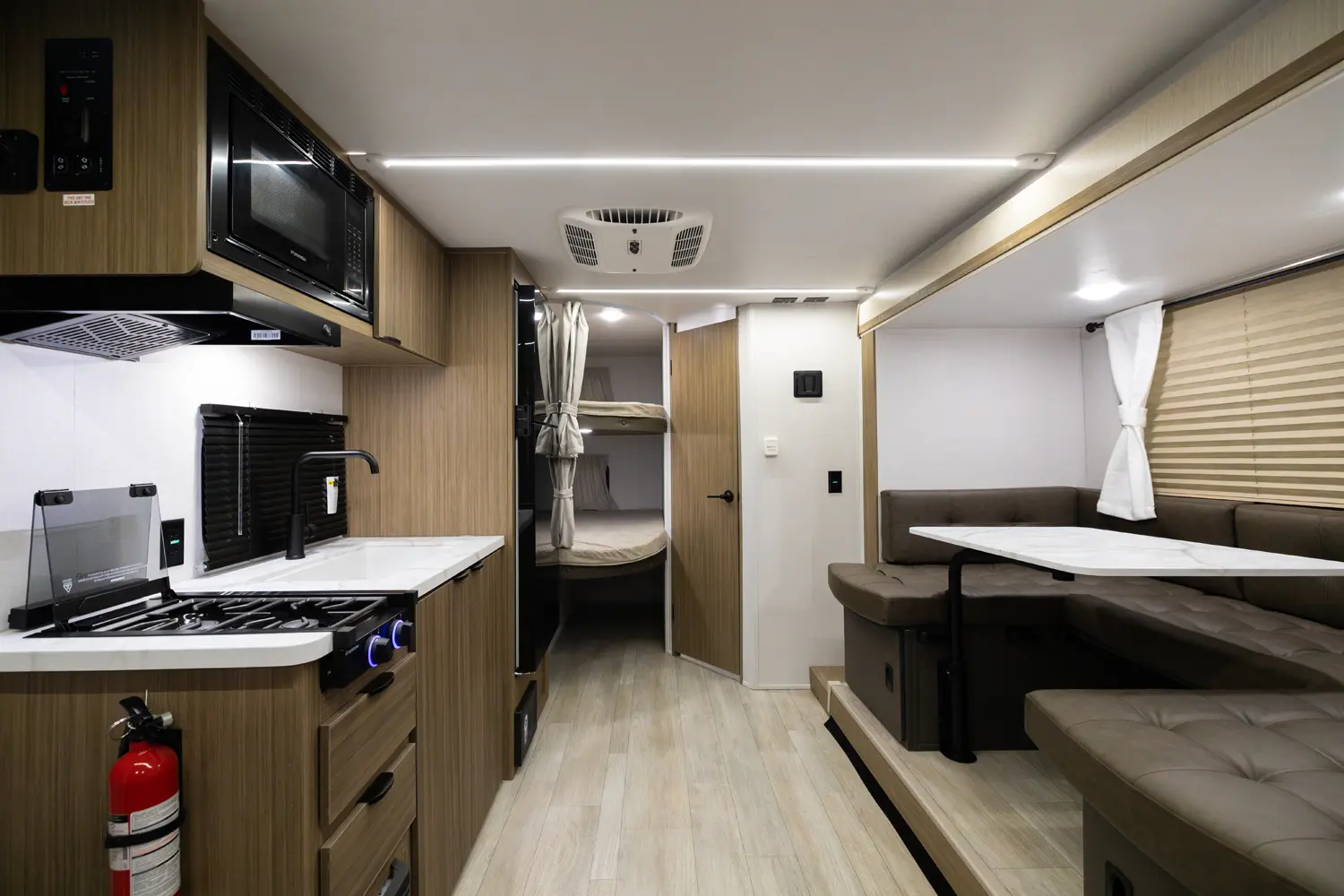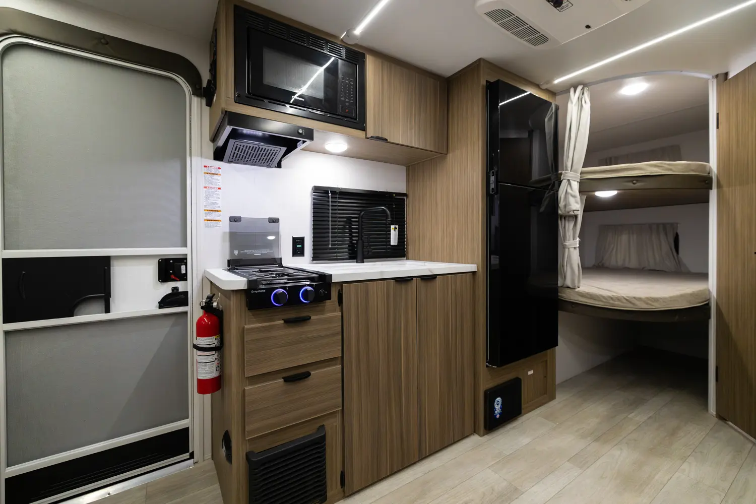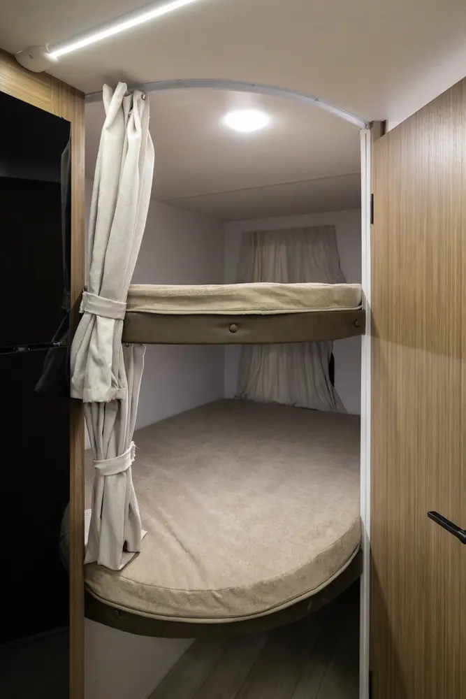 The 178BHSK is packed with features and weighs in at less than 4,000 lb. The unique front queen bed flips up to create additional seating space during the day. The kitchen slide provides extra room for the ever-popular U-dinette and includes a panoramic window. The rear bunkhouse gives you double over double bunks for additional flexibility and comfort, while the outside kitchen gives you additional options for mealtime and entertaining.