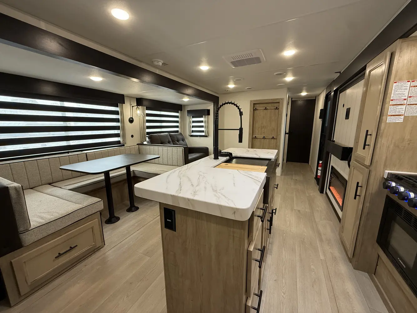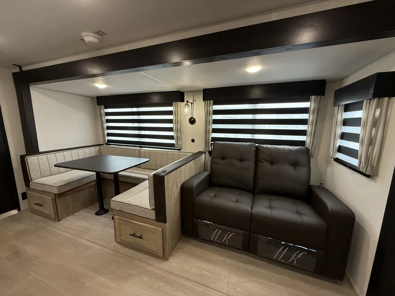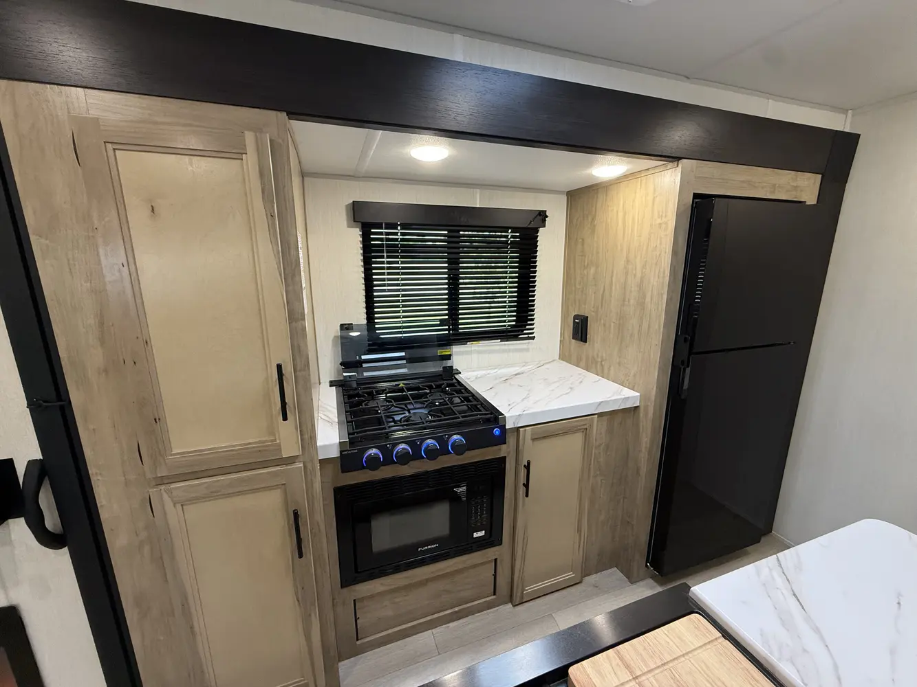 • Cherokee Black Label Wolf Den (Deep Tinted Frameless Automotive Glass Windows, High Gloss Gel Coat Exterior Sidewalls, Multicolor Reading Lights, Pillowtop Mattress Upgrade, Solid Surface Countertops, Thermo Foil Arctic Insulation)